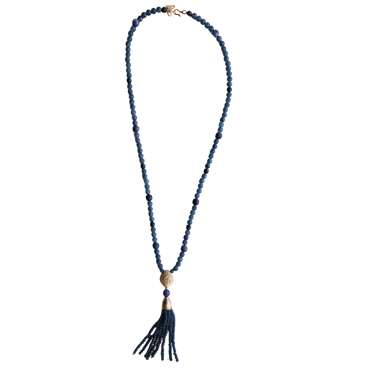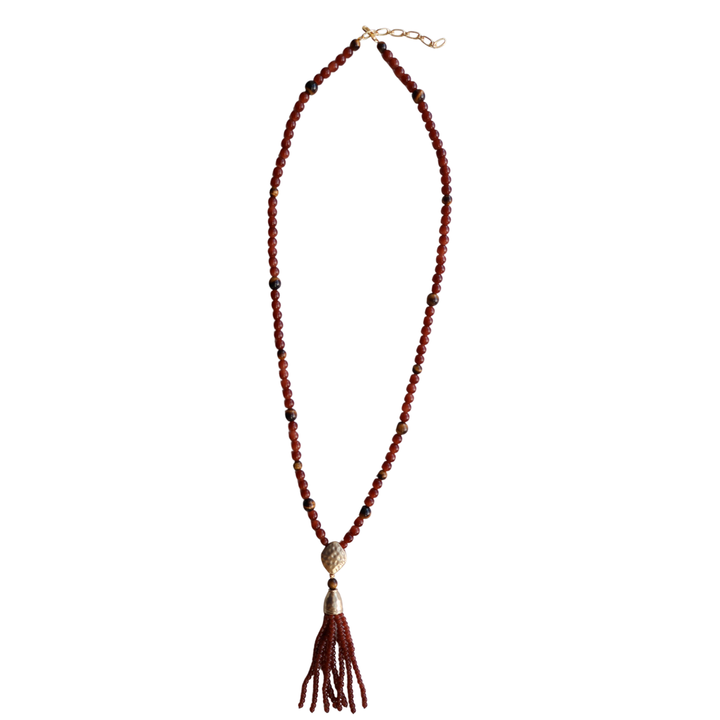 Featuring smooth stone beads, natural accent stones, and a textured gold-tone focal bead with a flowing tassel. Designed for effortless versatility, it can be worn long as a statement necklace or double-wrapped for a layered look. Rich in color and timeless in style.