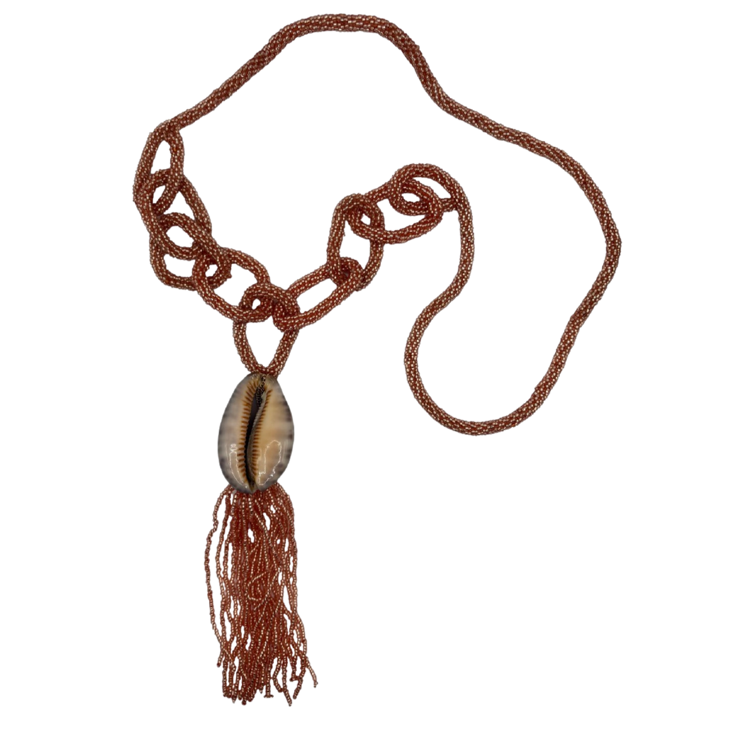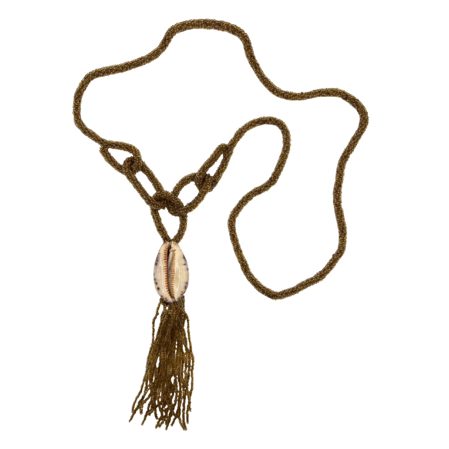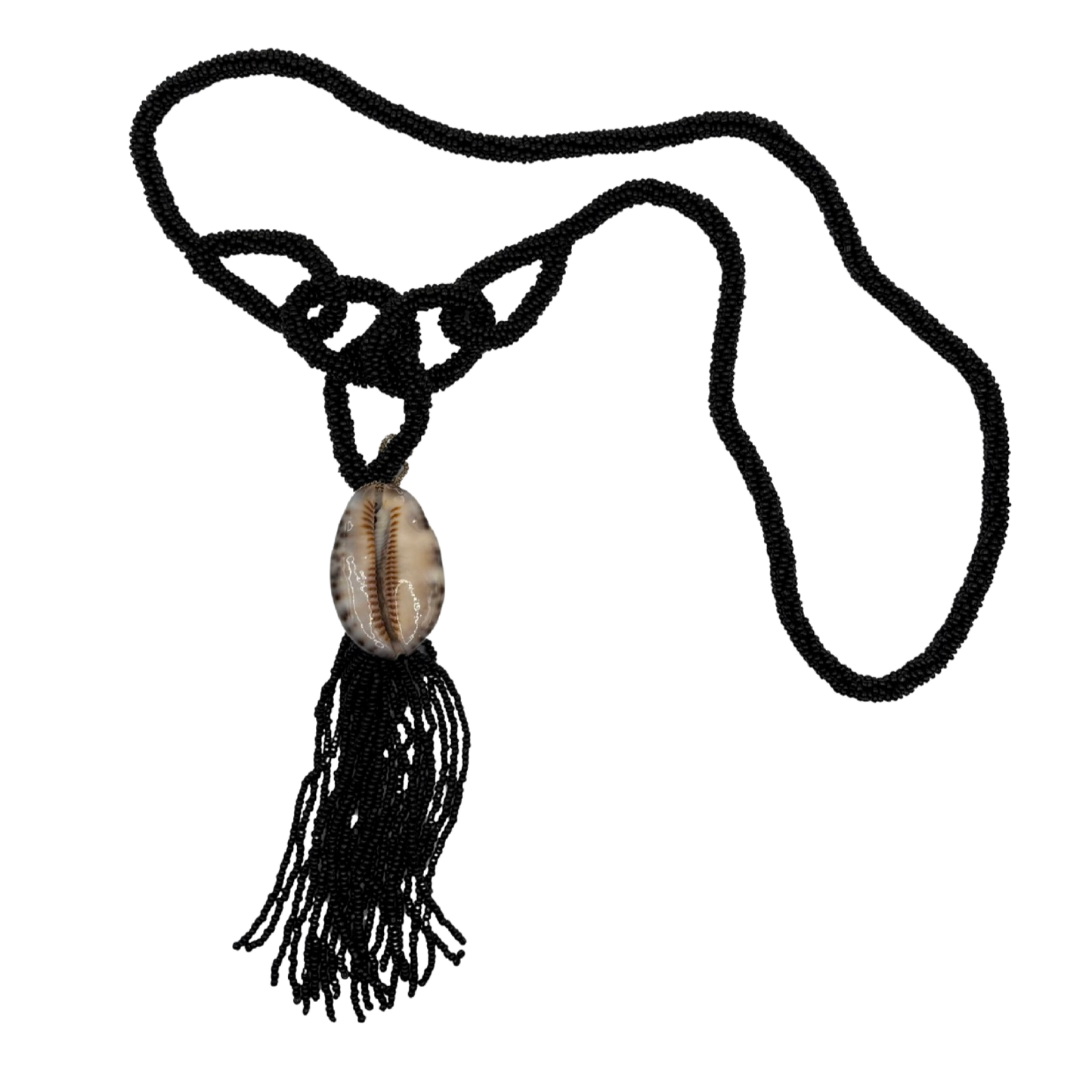 A beaded rope necklace featuring a natural cowrie shell centerpiece and a flowing beaded tassel. Wear it long or double wrapped, an earthy, edgy accessory perfect for the beach.