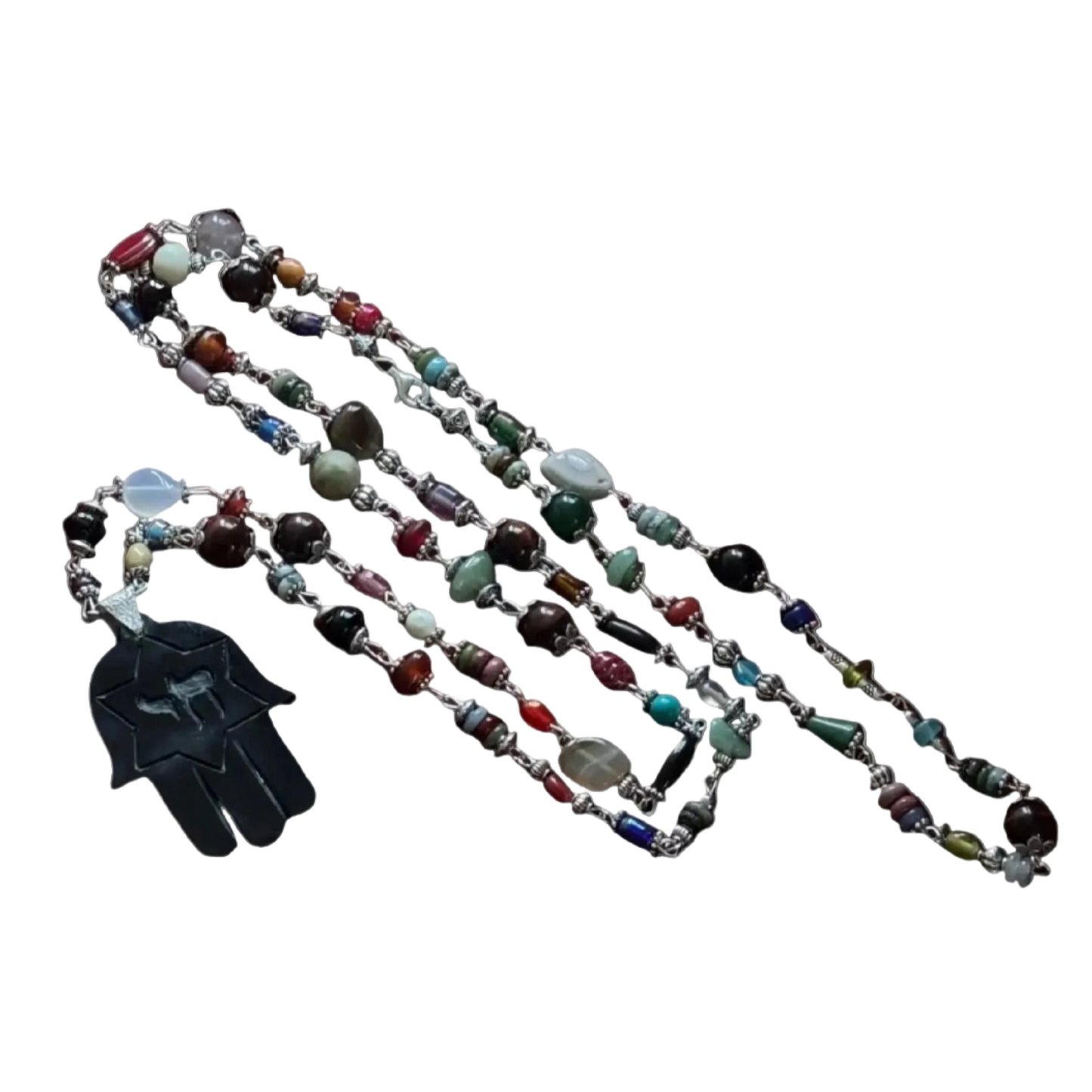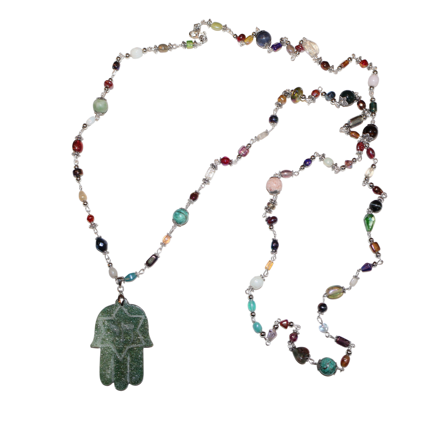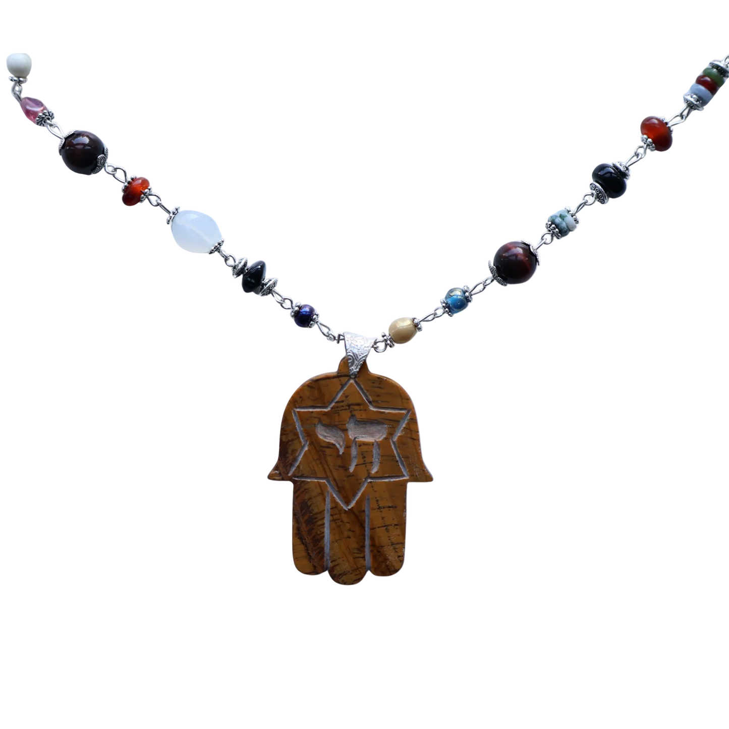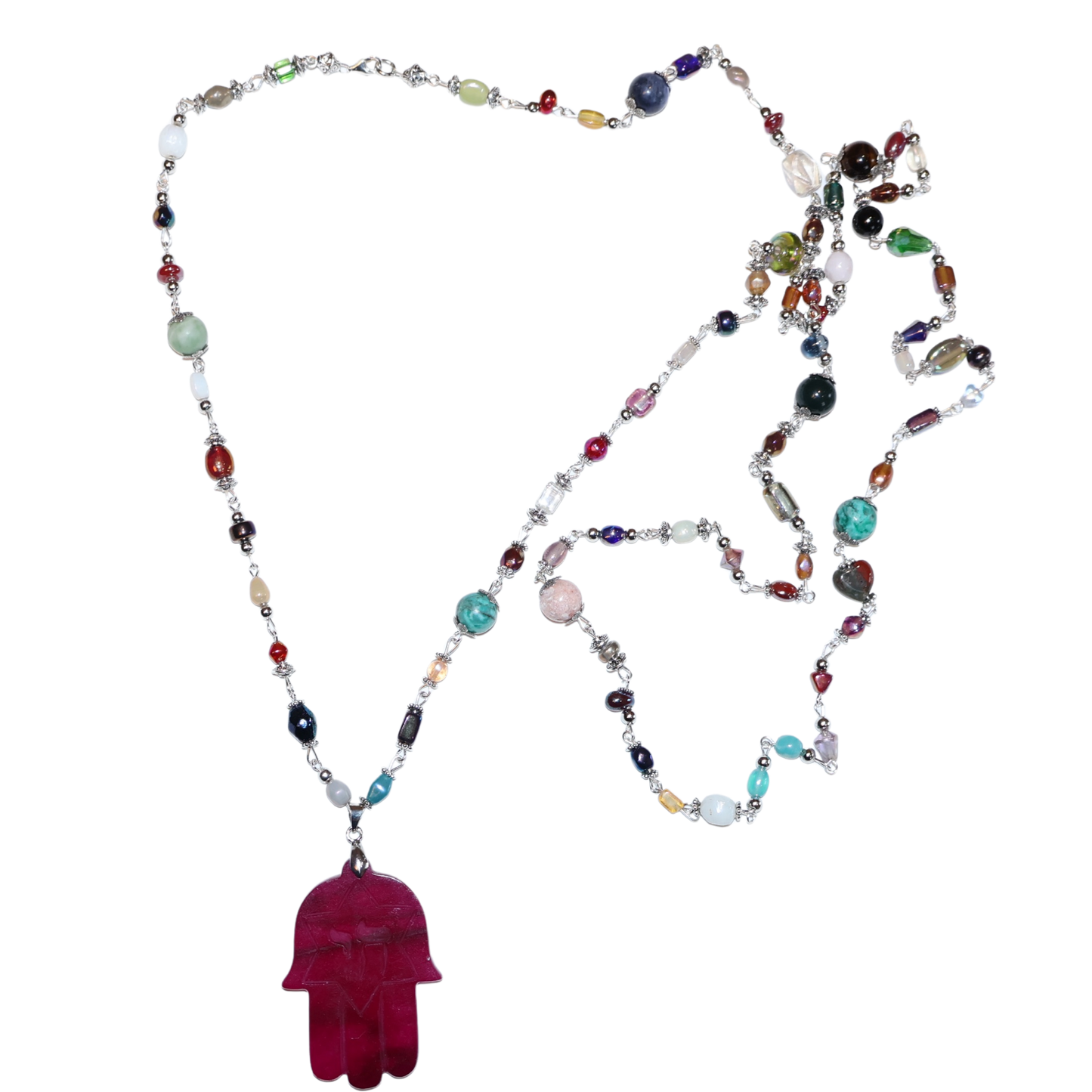 This one-of-a-kind necklace features a vibrant Hamsa hand pendant, a timeless symbol of protection, balance, and positive energy. The pendant is paired with a chain strand of mixed stones and glass beads in soft pastels, deep jewel tones, and earthy accents, creating a harmonious blend of color and texture