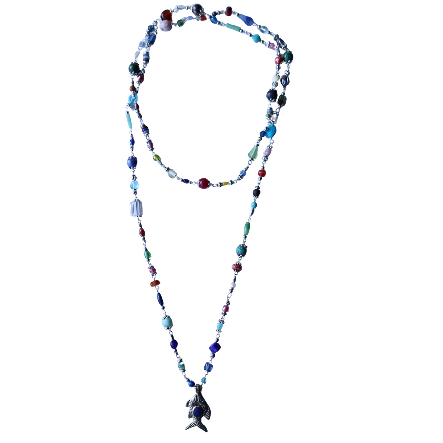 A playful chain of mixed gemstone beads in vibrant, earthy tones, finished with a silver-tone fish charm at the center