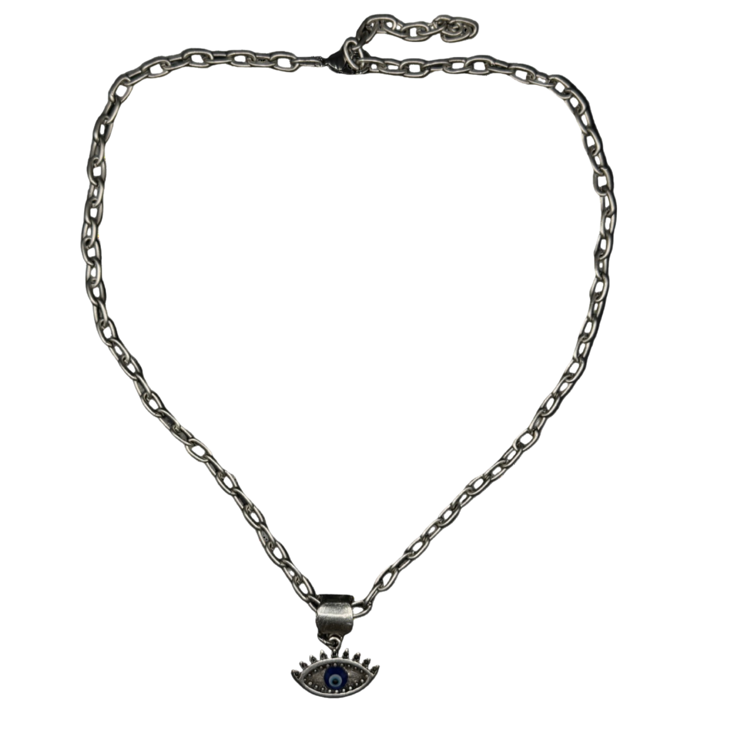 The Eye Necklace channels quiet strength and timeless edge. Handcrafted in silver-tone metal with a deep sapphire center, the all-seeing eye pendant rests on a bold yet delicate chain that layers effortlessly with anything.
