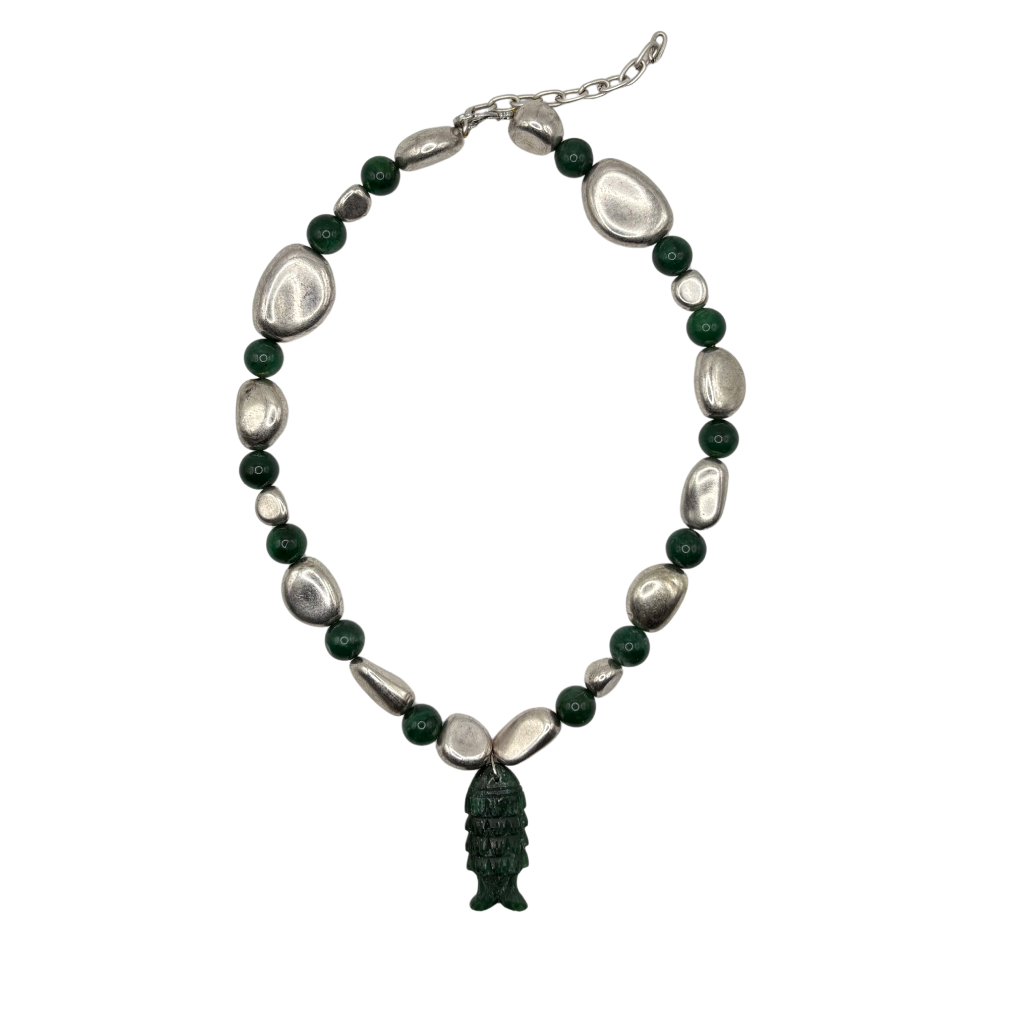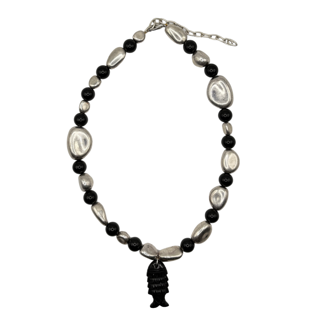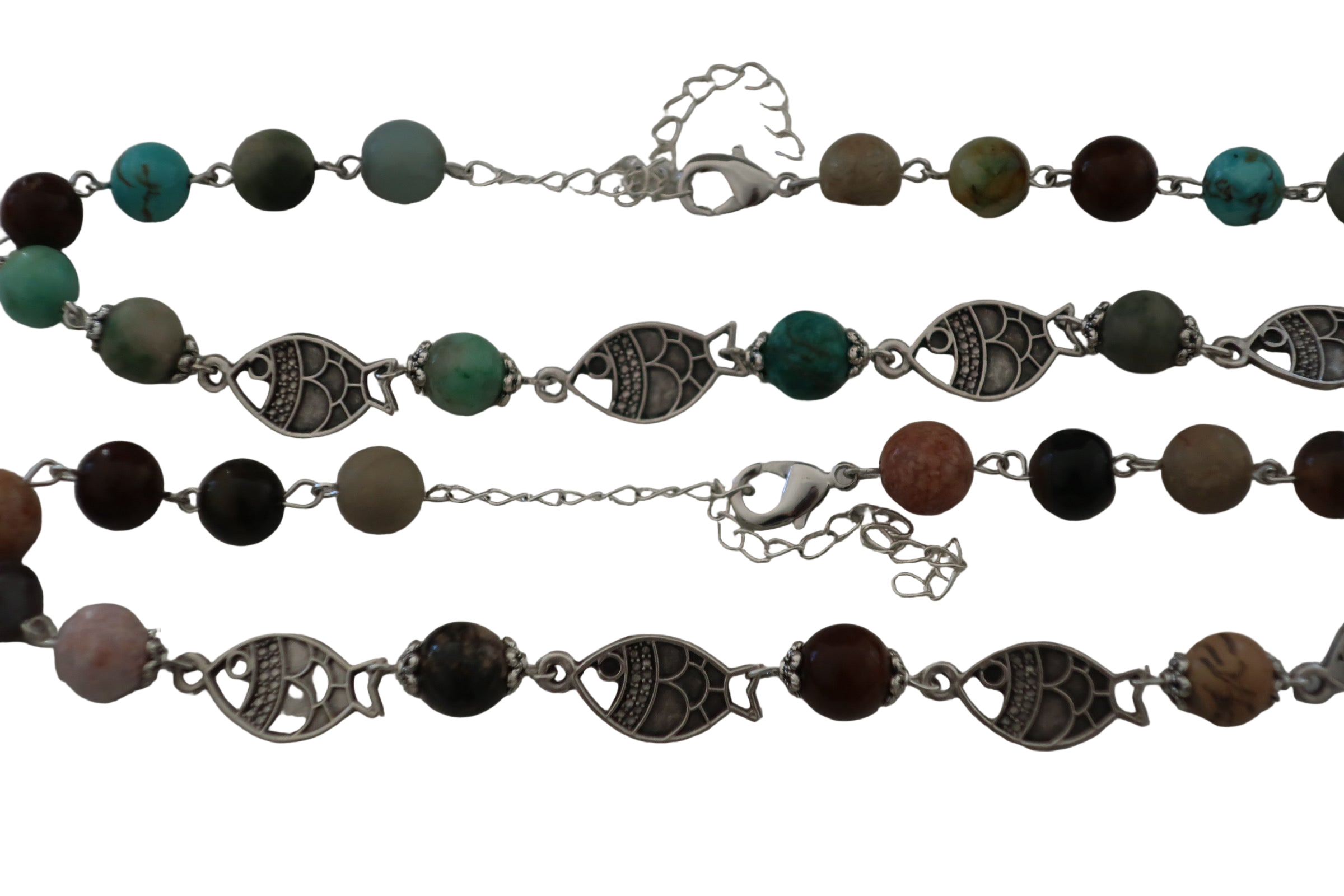 A mix of soft-toned stones and detailed silver fish accents give this necklace a unique, modern look. Each bead is linked together to form a smooth, eye-catching chain that pairs effortlessly with any outfit.