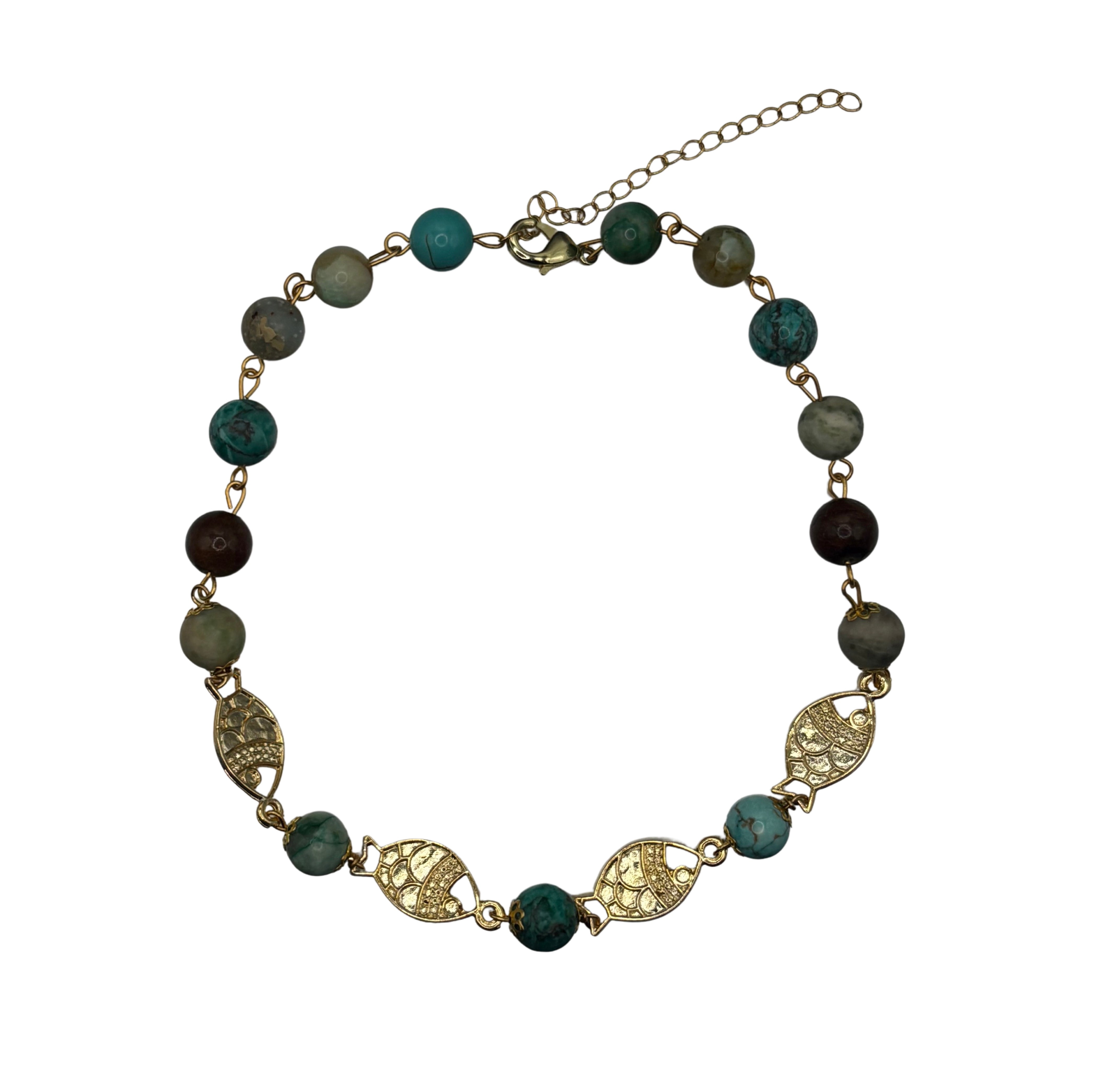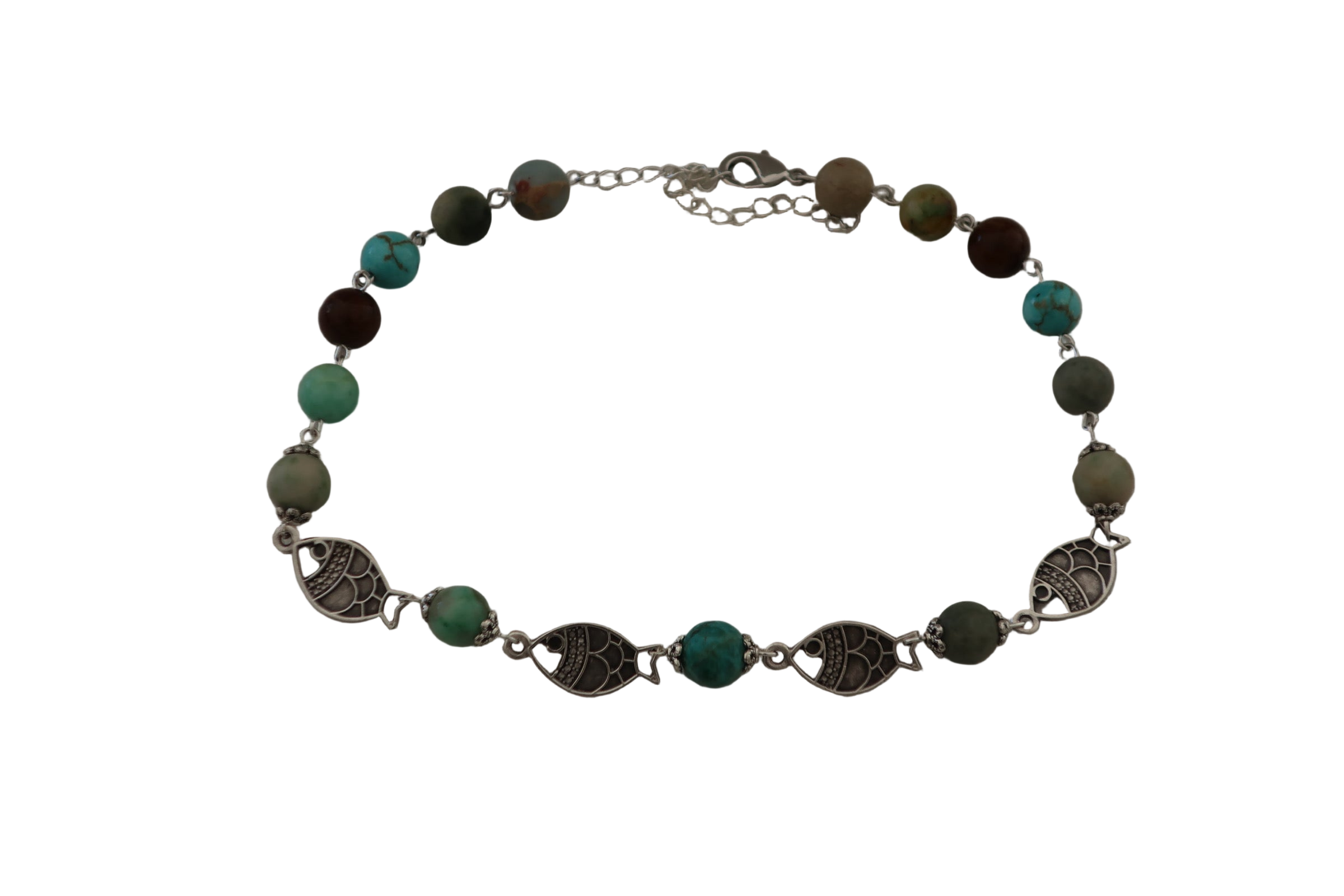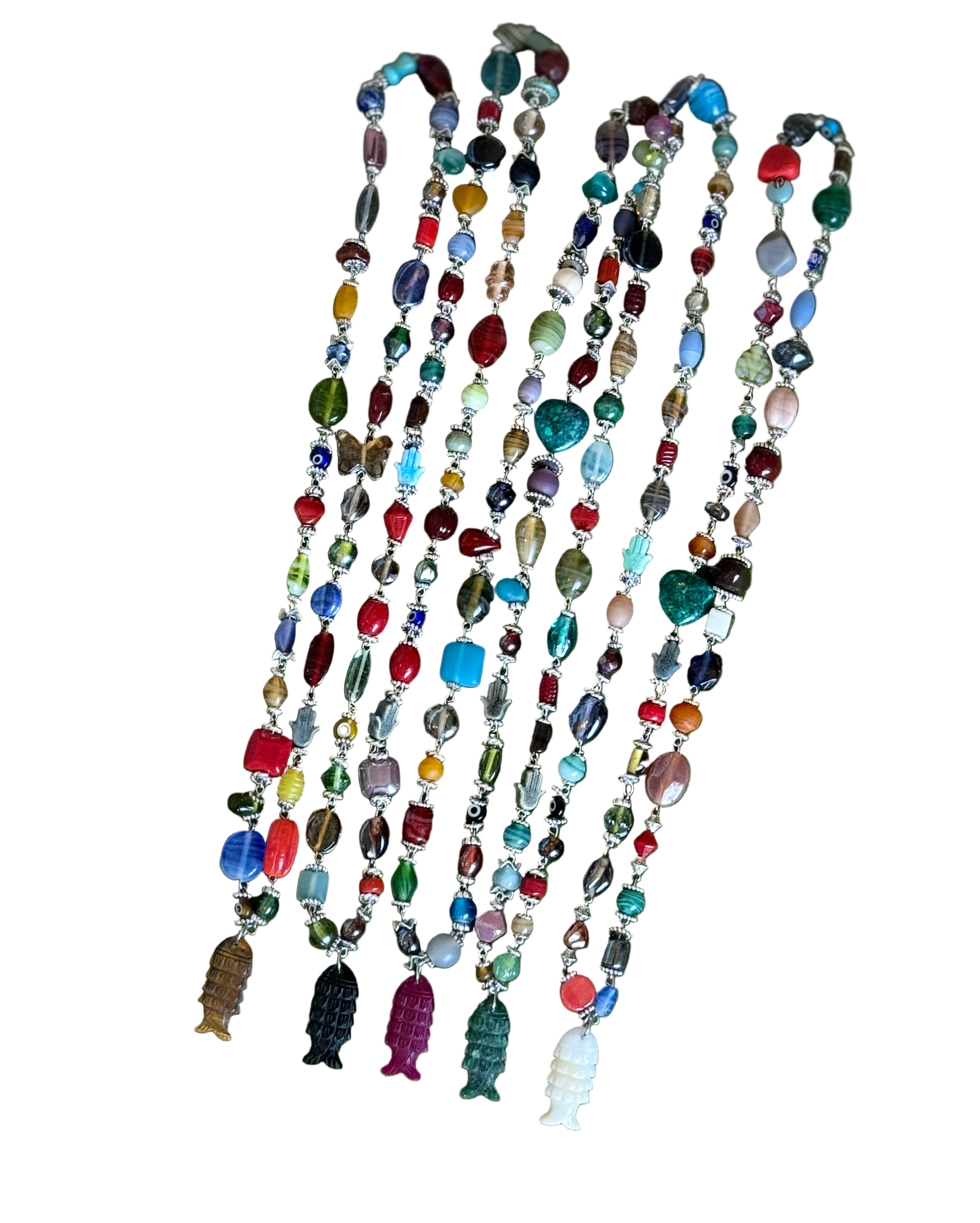 A mix of soft-toned stones and detailed silver fish accents give this necklace a unique, modern look. Each bead is linked together to form a smooth, eye-catching chain that pairs effortlessly with any outfit.