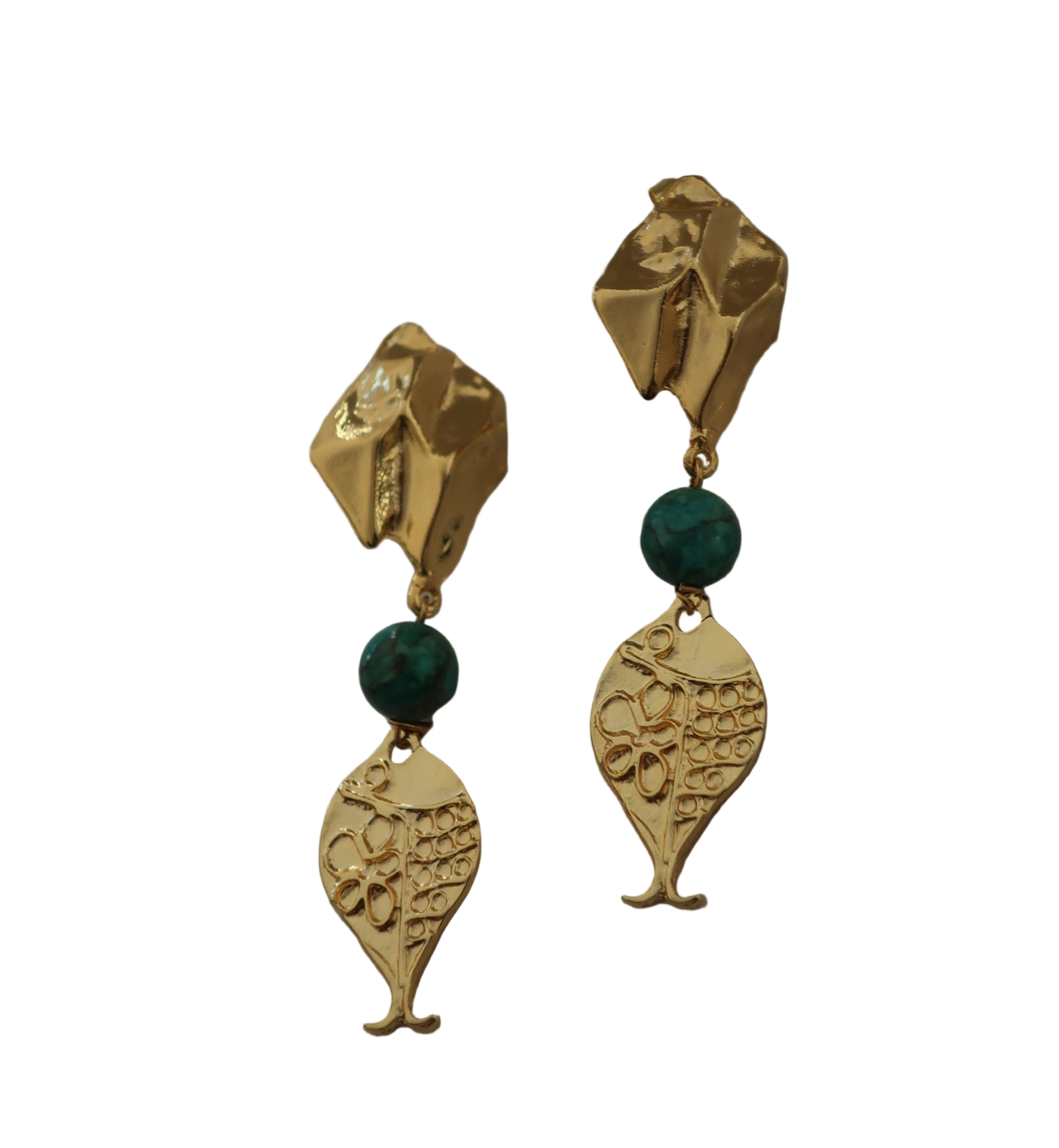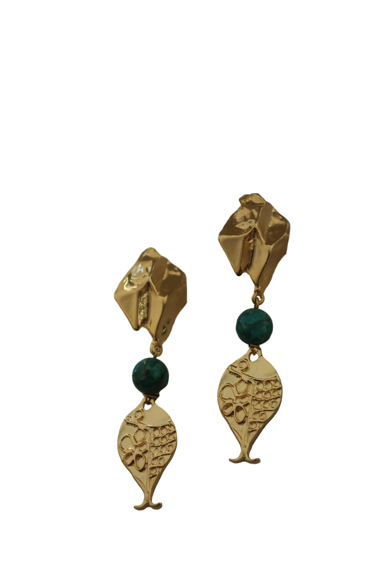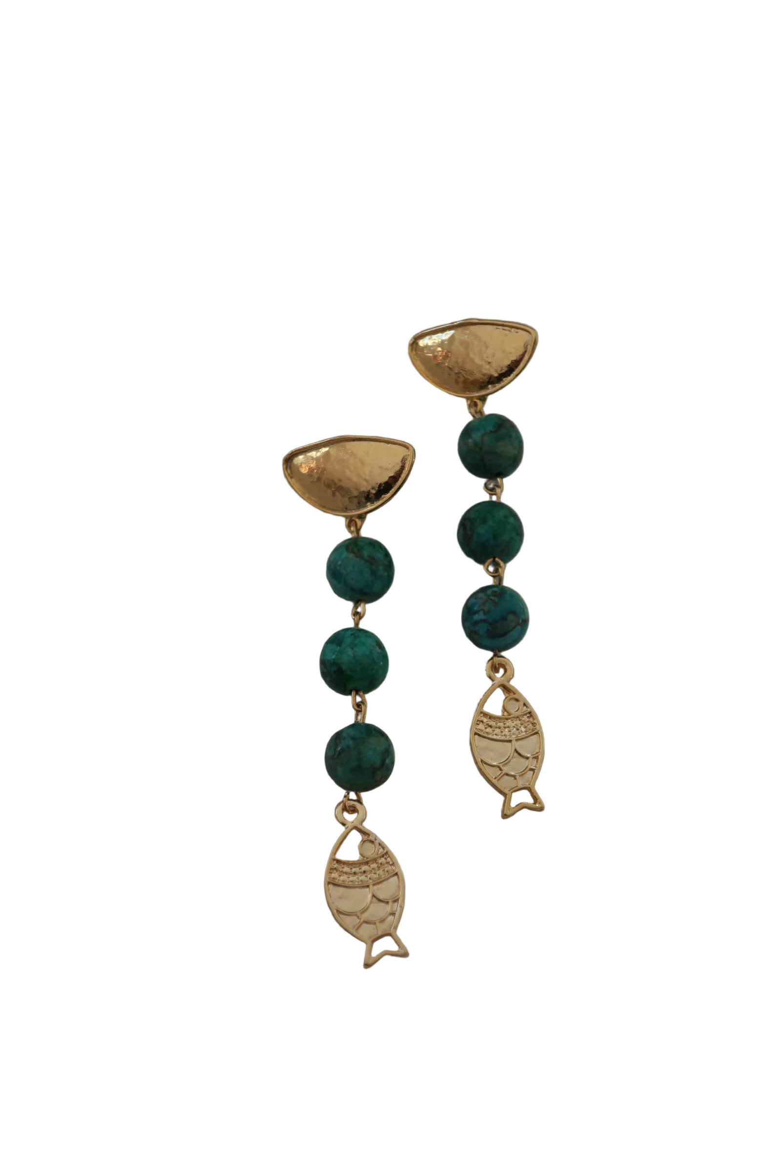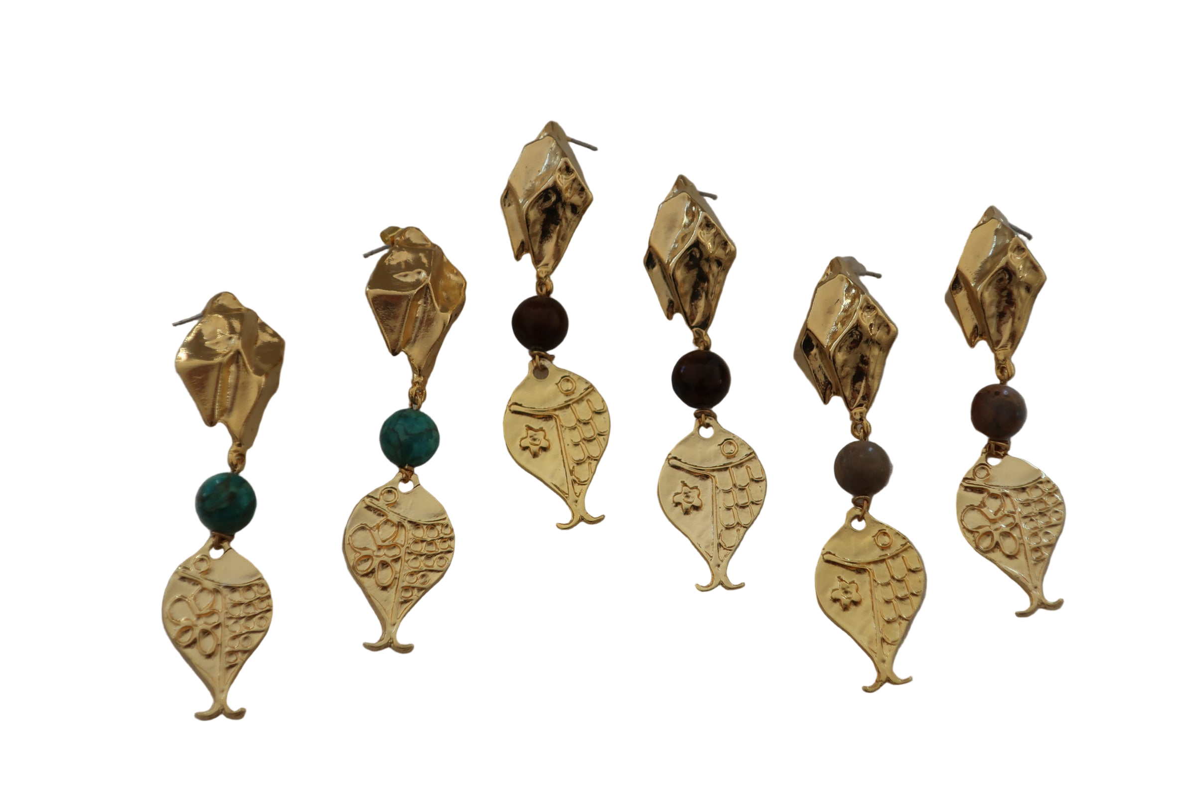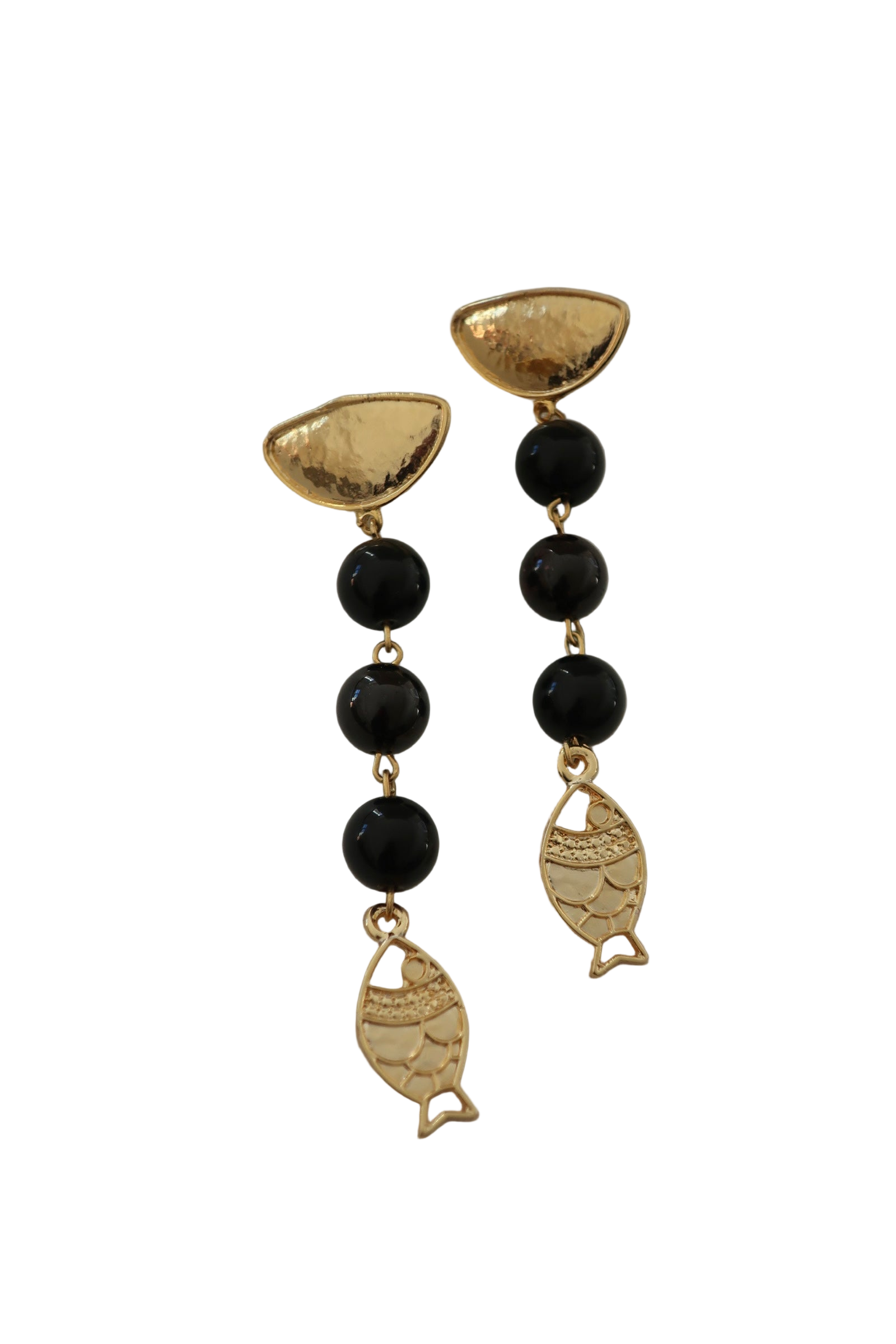 These Fish droplet earrings feature rich African turquoise, and black onyx beads linked with gold details and finished with a delicate gold fish charm. The combination of vibrant color and warm metal makes them a standout accessory that adds a fun, elegant touch to any look.