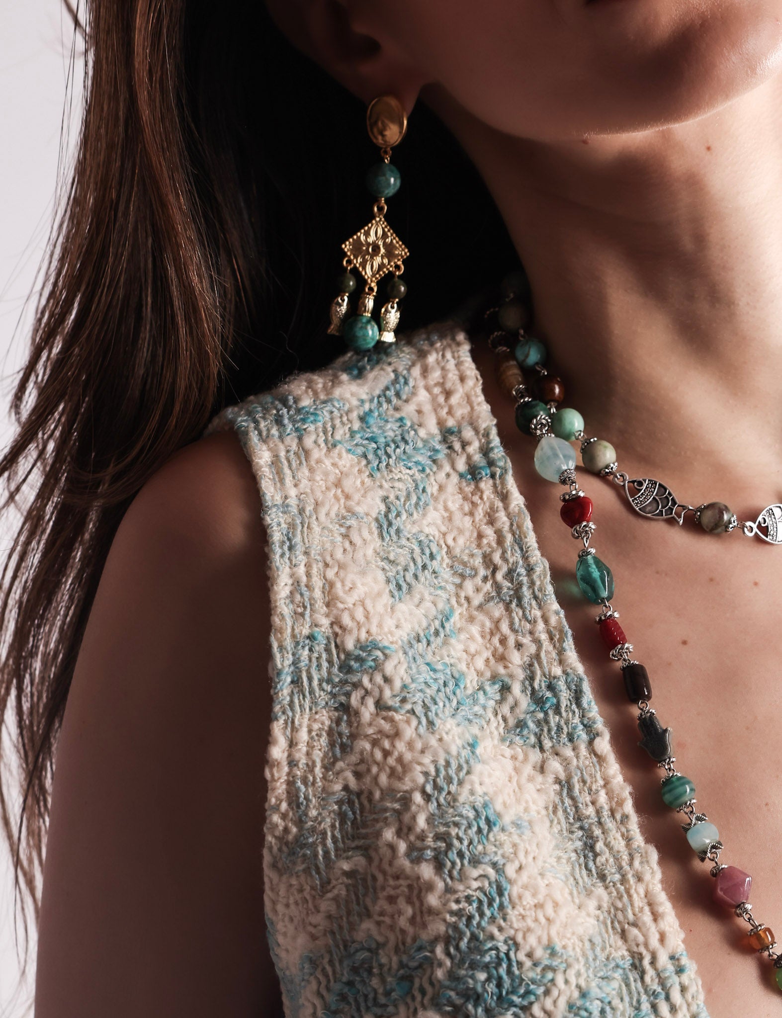 These elegant earrings feature gemstone beads paired with detailed silver/gold accents. Each piece is linked together to create a flowing, eye-catching design that moves beautifully. The mix of silver shapes and smooth stones adds a touch of color and style to any outfit.