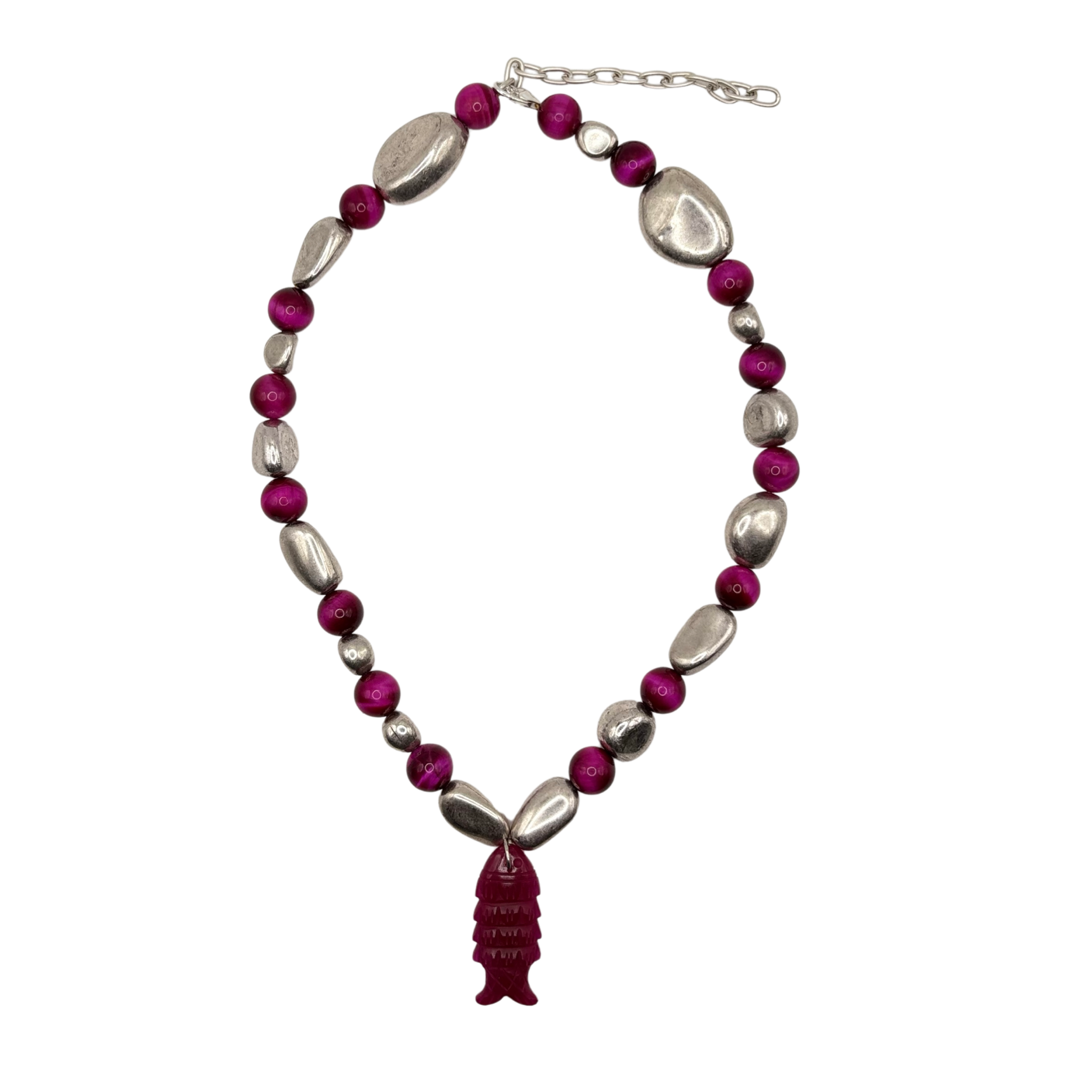 A lively mix of a colorful beaded chain, finished with a tiger eye stone fish pendant. bold yet effortlessly wearable.