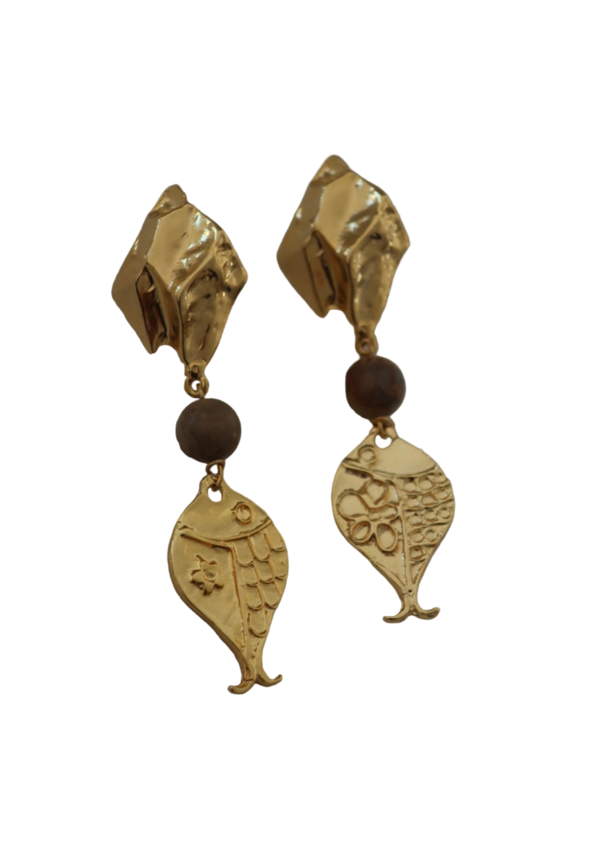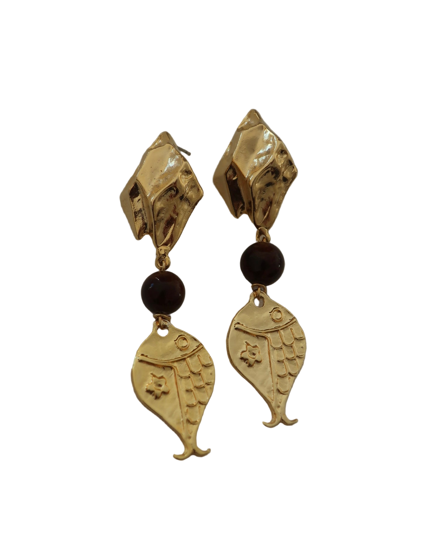 These bold gold statement earrings feature unique fish charms that add a fun yet elegant touch to any outfit. The textured gold design catches the light beautifully, making them perfect for both everyday wear and special occasions.