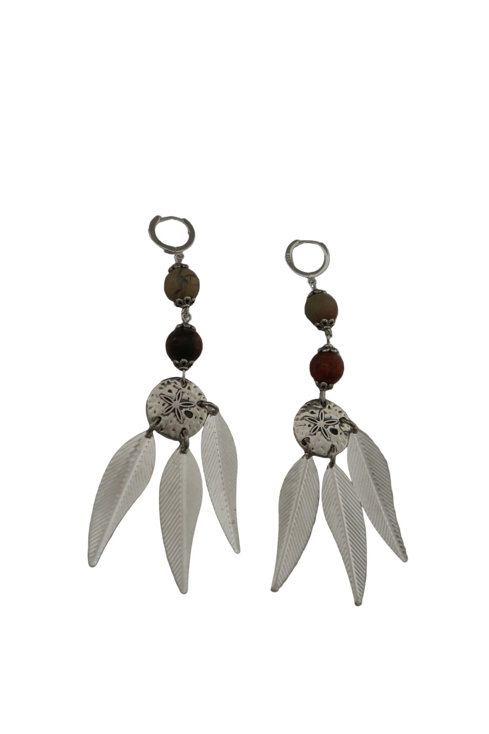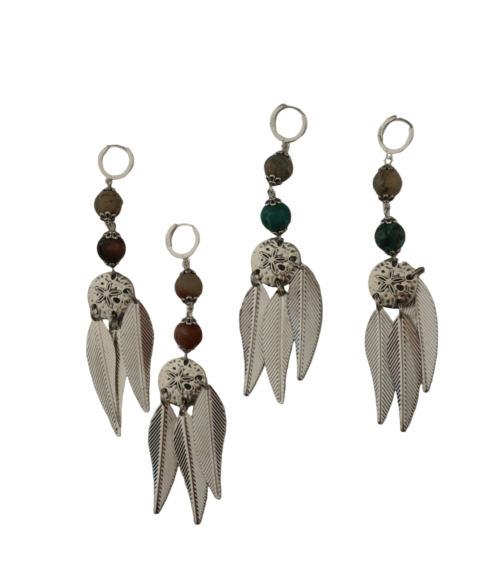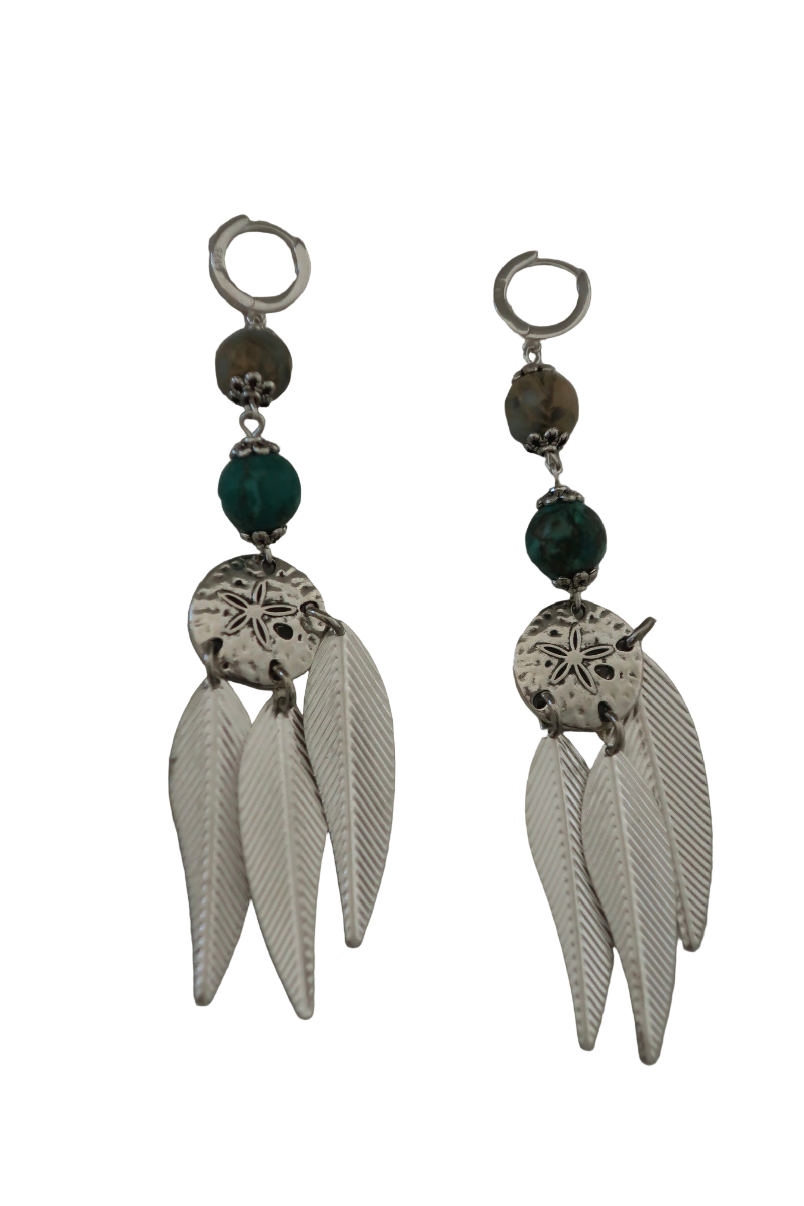 A mix of sea-inspired details and soft movement these silver earrings combine textured sea coin charms with layered feathers and natural stone beads. Elegant, fluid, and easy to wear, they bring a subtle statement to any look.