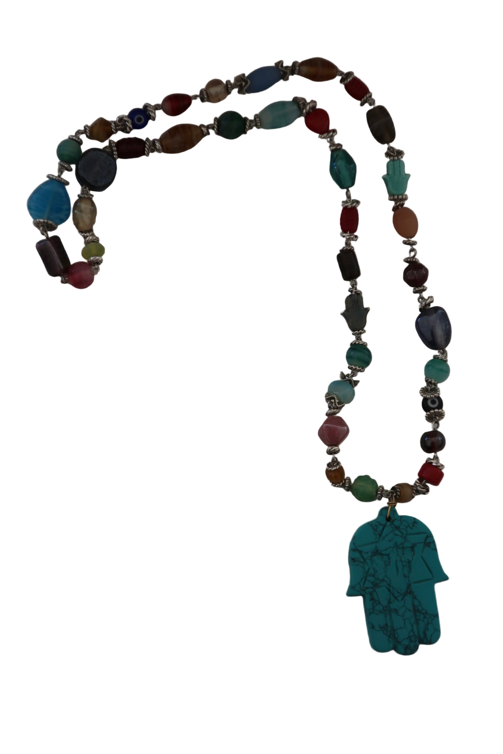 A chain of warm colored beads finished with a white hamsa. textured, relaxed, and effortless.
