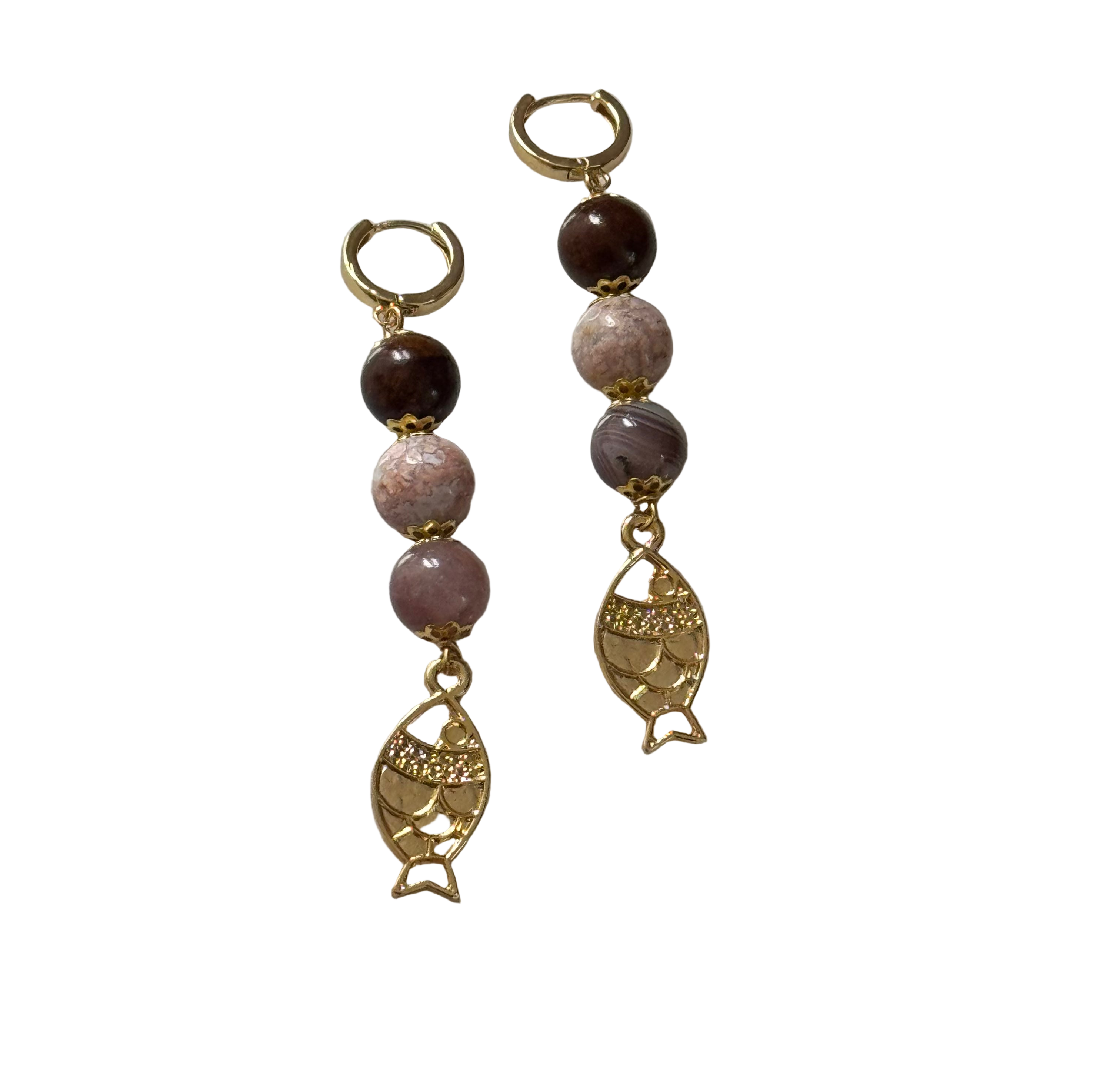 Carved stone fish with matching stone beads and silver flower tops. colorful, easy, and made to stand out naturally.