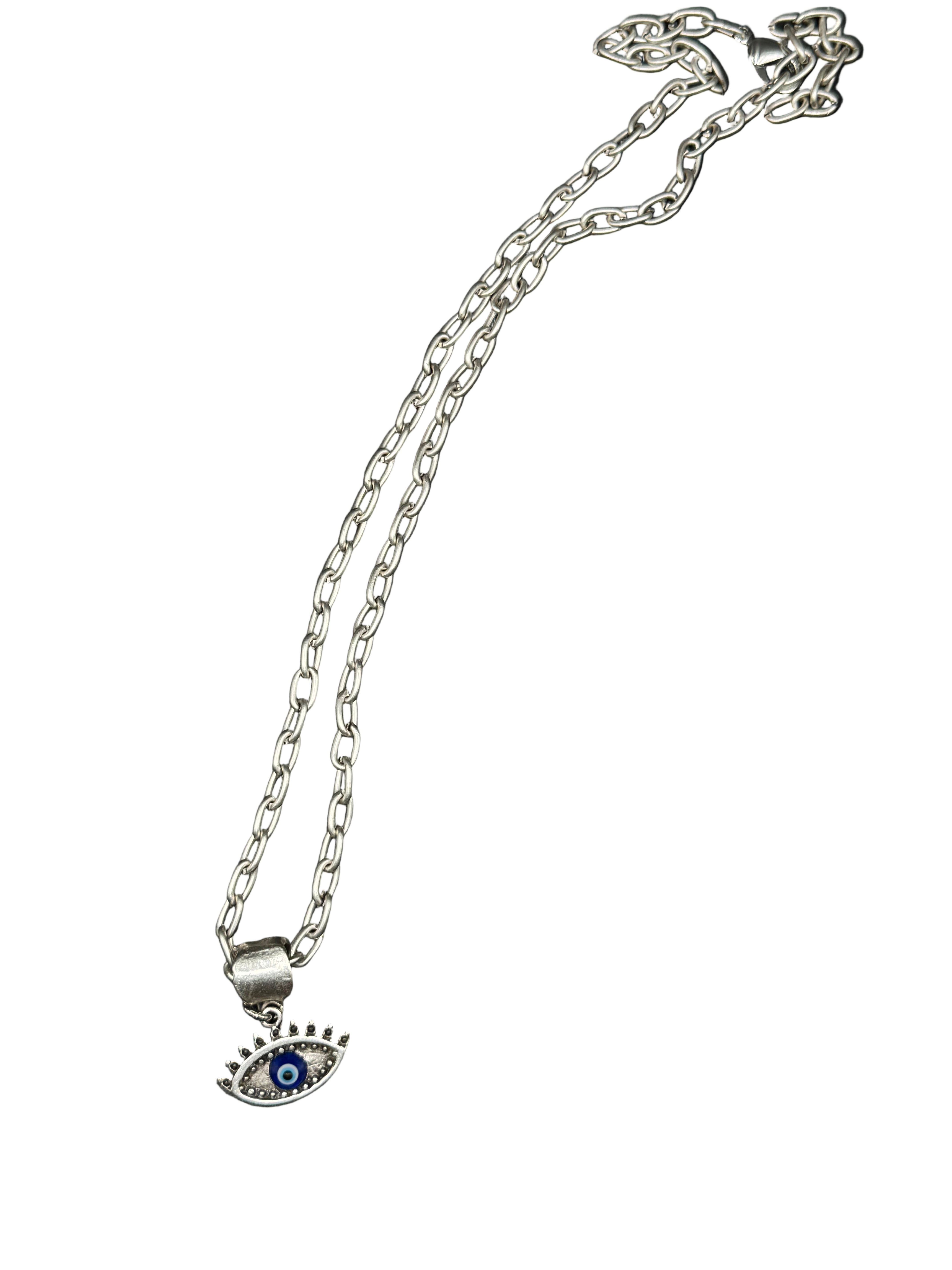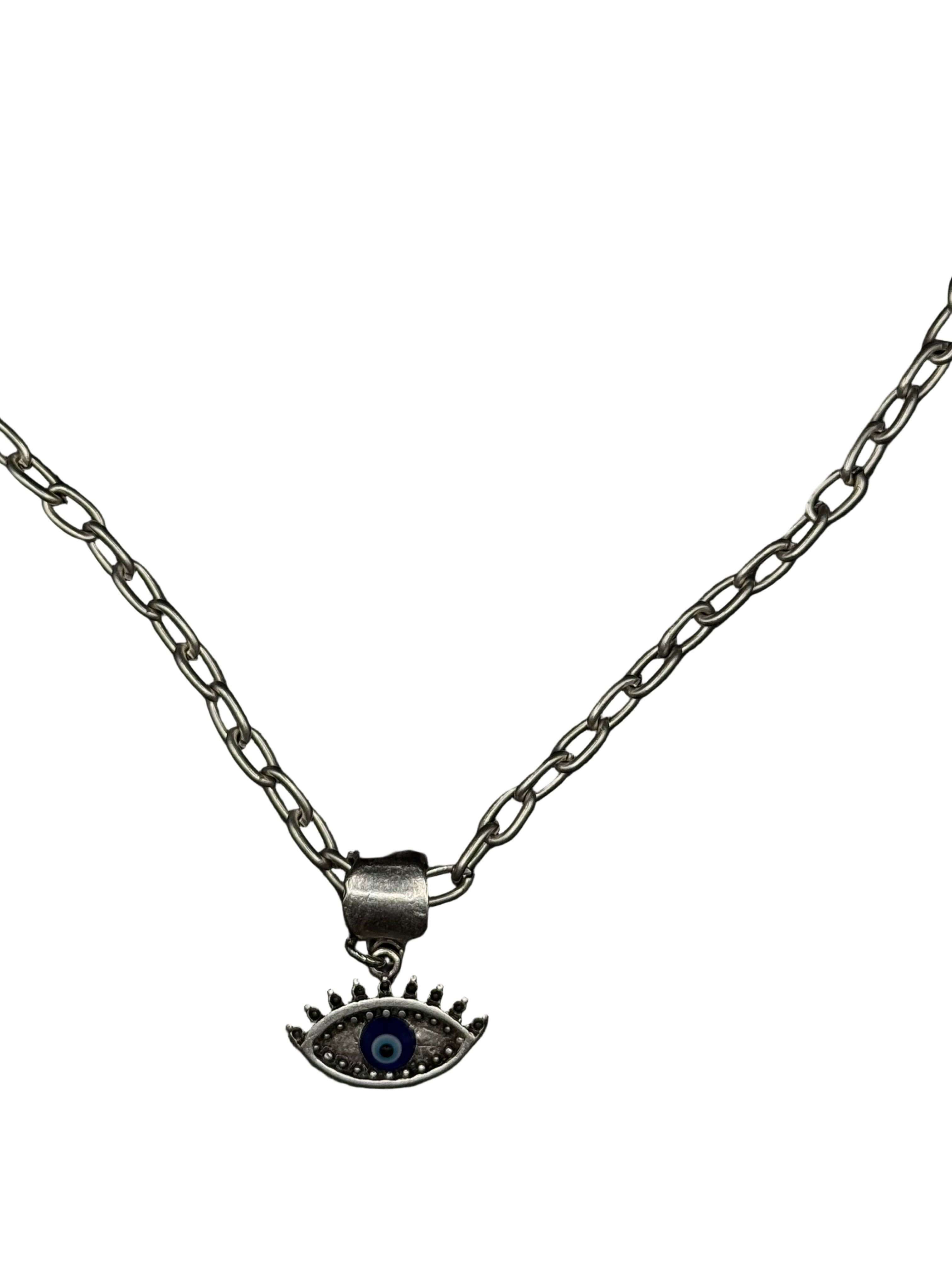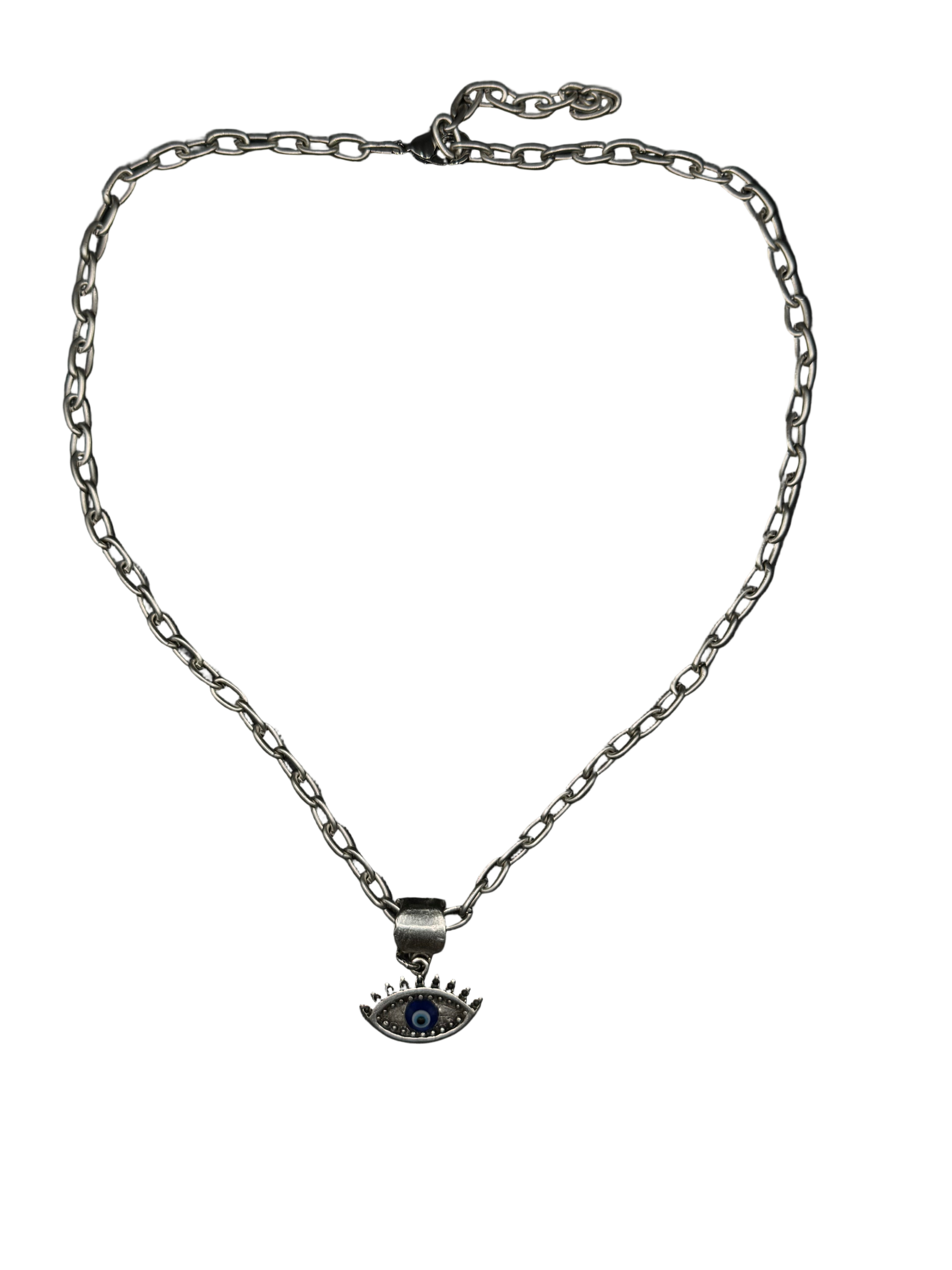The Eye Necklace channels quiet strength and timeless edge. Handcrafted in silver-tone metal with a deep sapphire center, the all-seeing eye pendant rests on a bold yet delicate chain that layers effortlessly with anything.