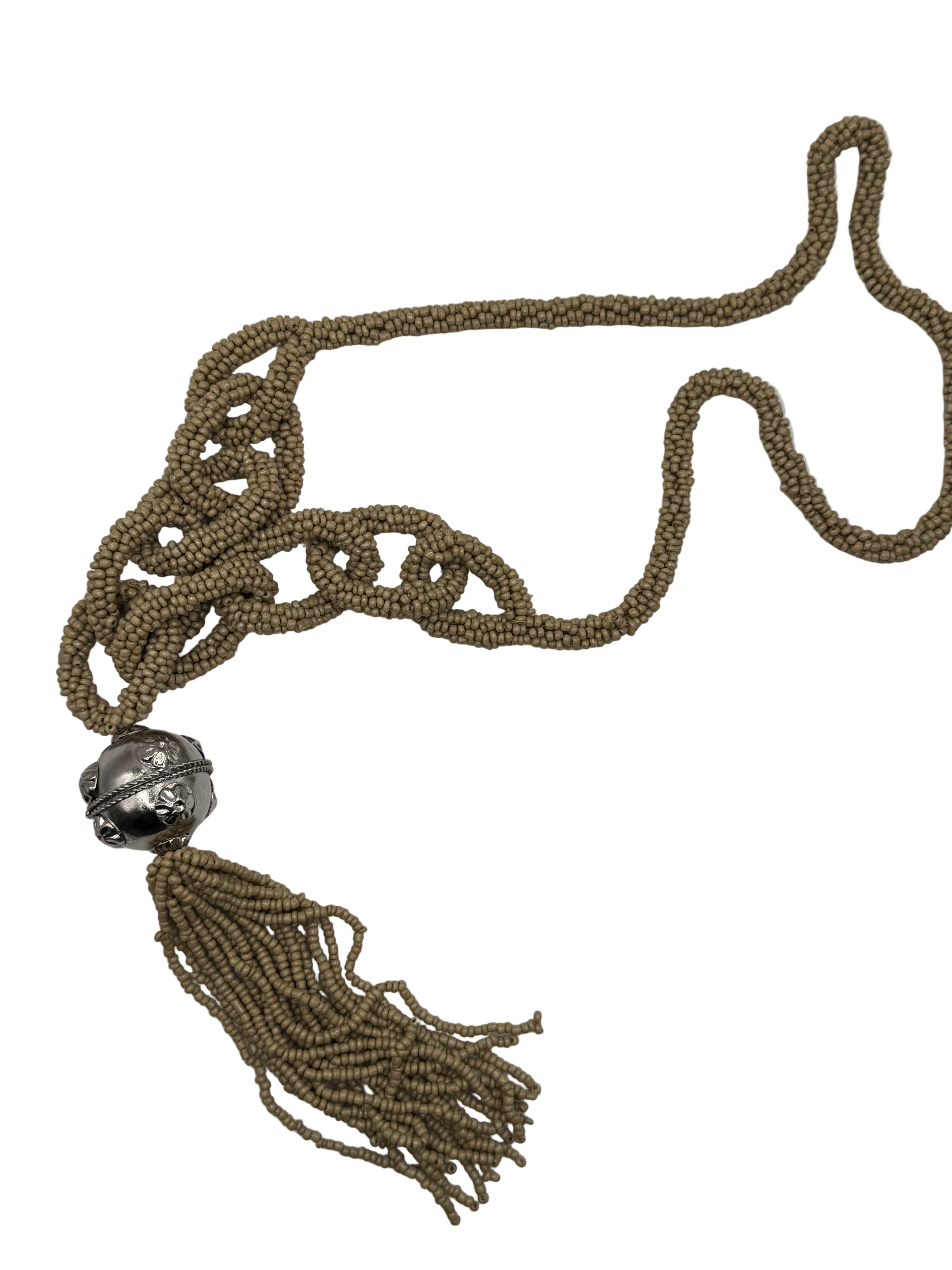 A beaded rope necklace featuring a natural cowrie shell centerpiece and a flowing beaded tassel. Wear it long or double wrapped, an earthy, edgy accessory perfect for the beach.