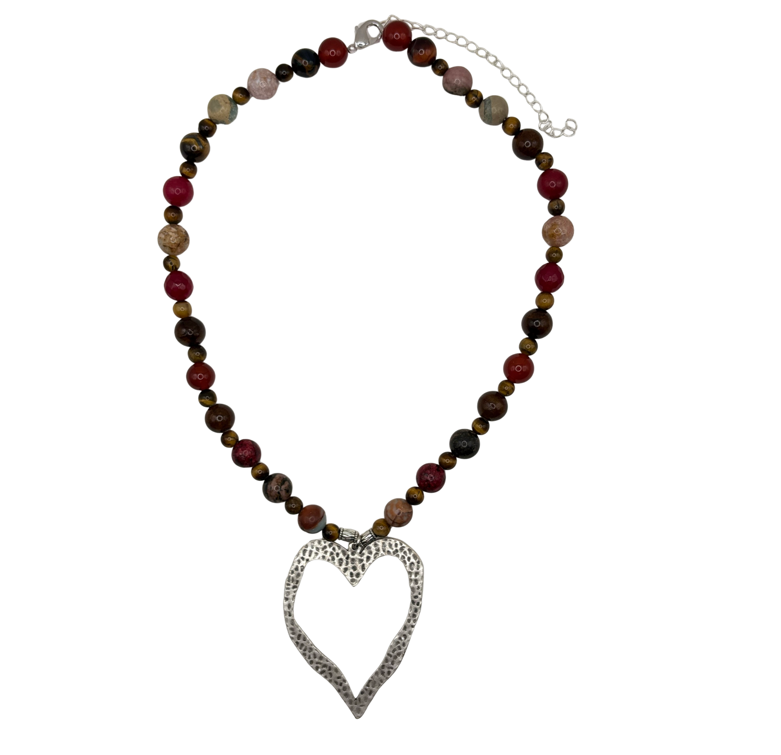 This elegant handcrafted necklace combines the natural beauty of polished gemstone beads with a striking hammered heart pendant. Each bead is carefully selected in rich earthy tones of red, brown,and pinks,creating a warm and balanced color palette. The statement heart pendant adds a touch of sophistication and modern artistry, making this piece both timeless and unique.