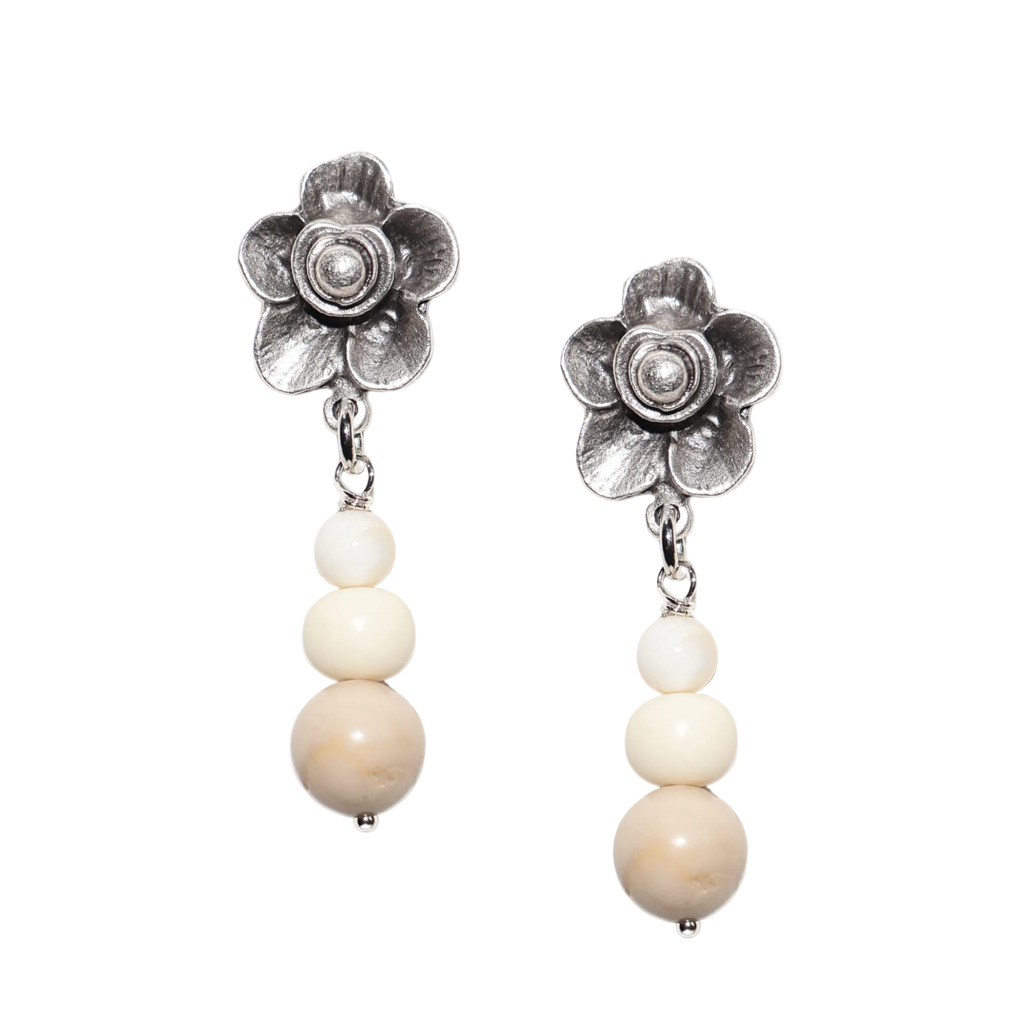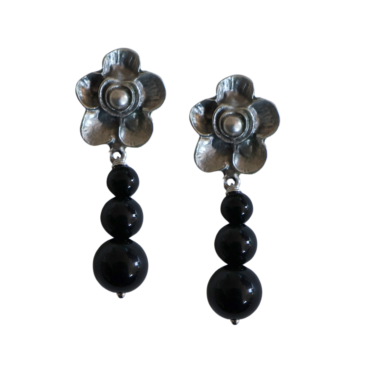 Silver-tone flower stud earrings with a delicate drop of three graduated stone beads. Feminine, timeless, and easy to wear