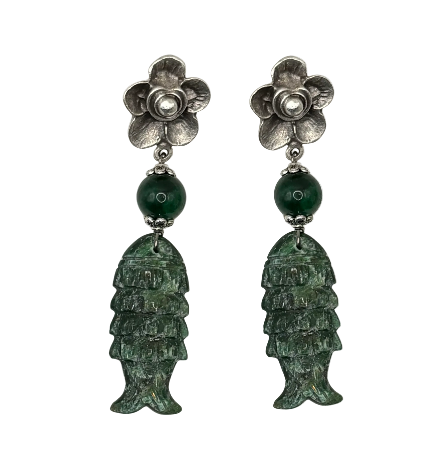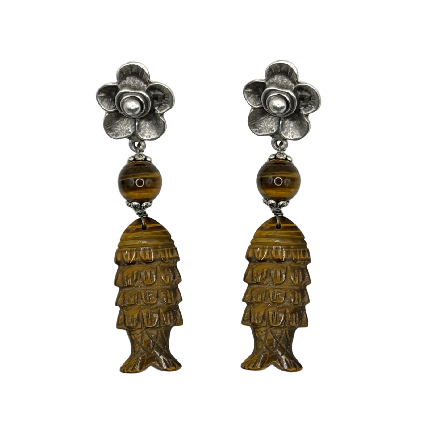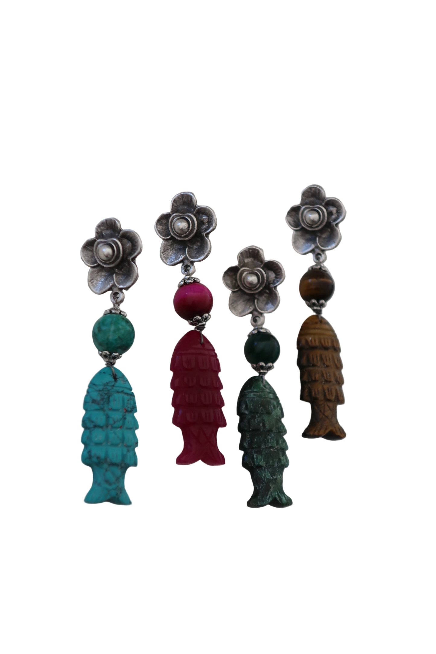 Carved stone fish with matching stone beads and silver flower tops. colorful, easy, and made to stand out naturally.