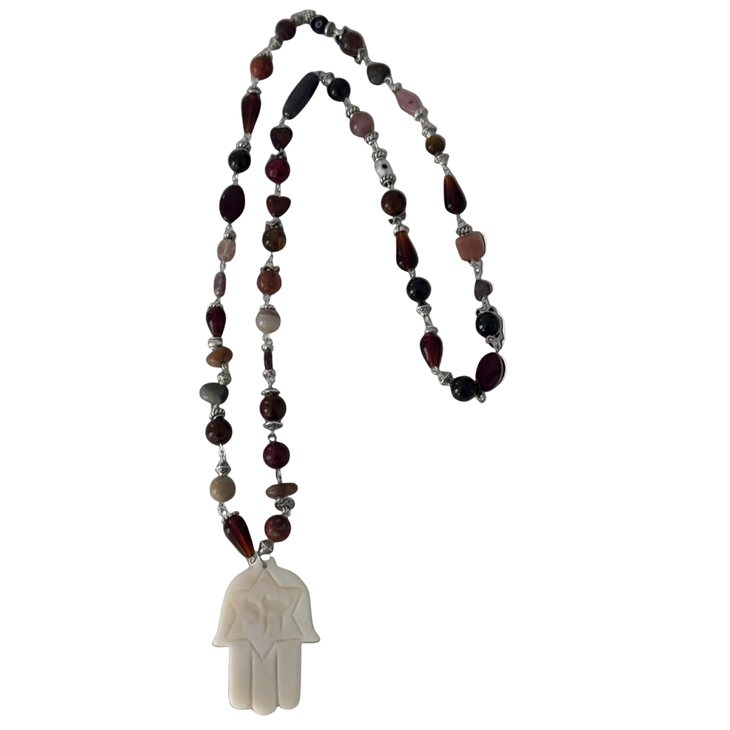 A chain of warm colored beads finished with a white hamsa. textured, relaxed, and effortless.