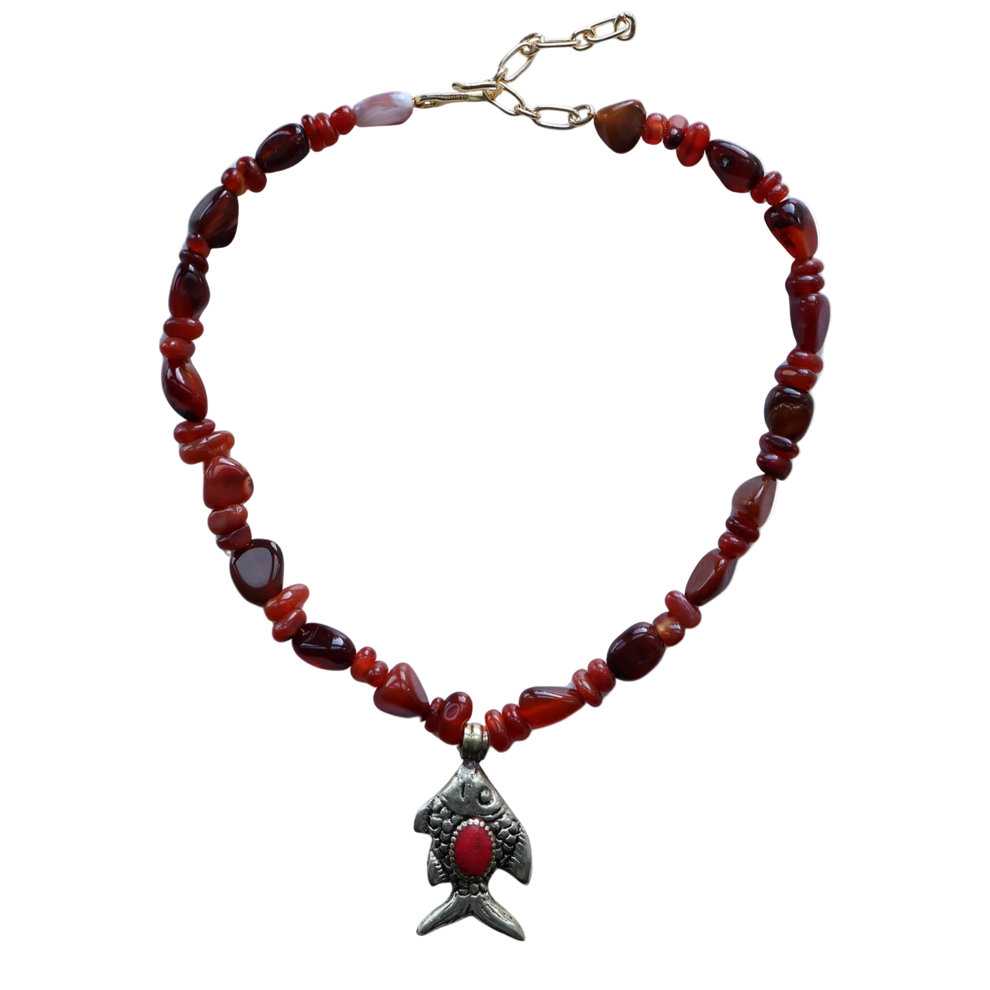 Silver fish pendant on a strand of natural red gate beads. Red agate is believed to provide strength, courage, and protection. It acts as a grounding stone, stabilizing emotions and fostering a sense of security. By connecting to the root chakra, it also boosts creativity, motivation, and vitality. Red agate is used to promote passion, confidence, and resilience, helping individuals overcome challenges and find balance.
