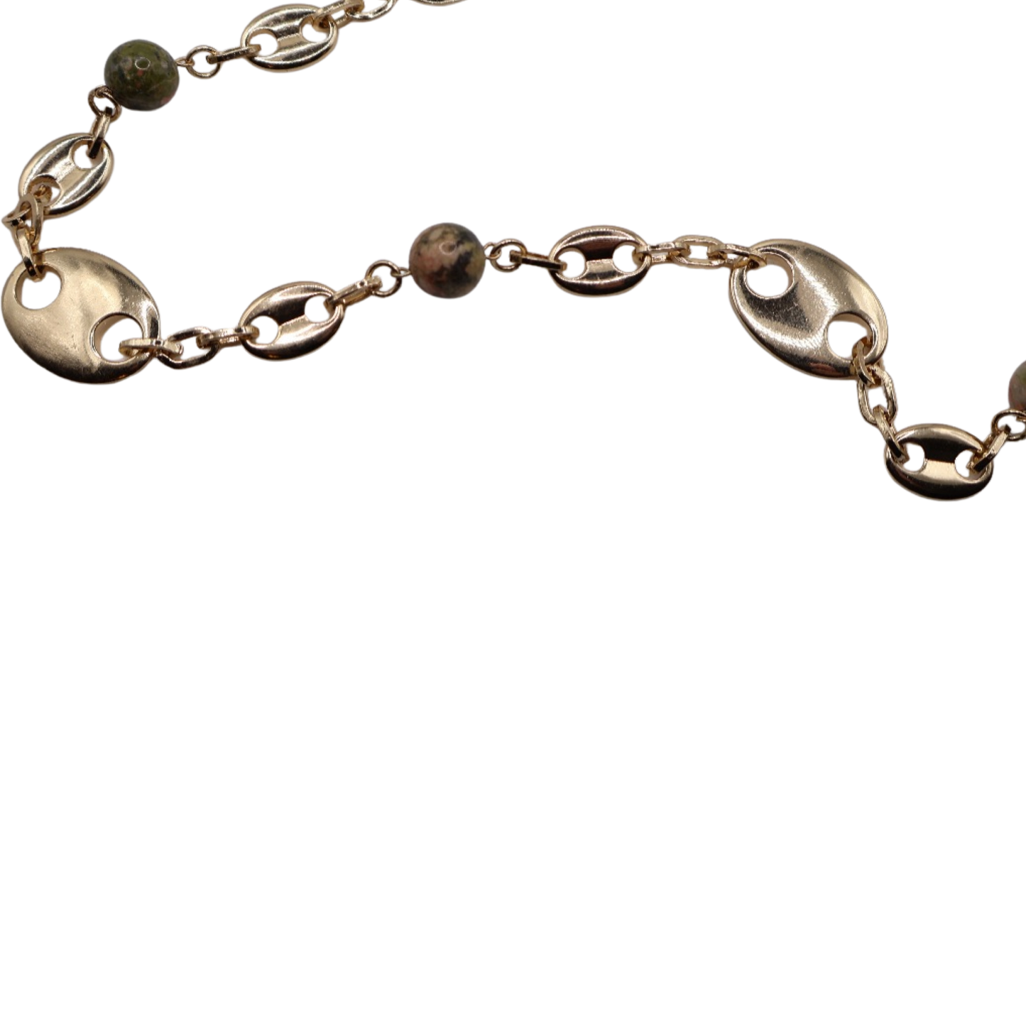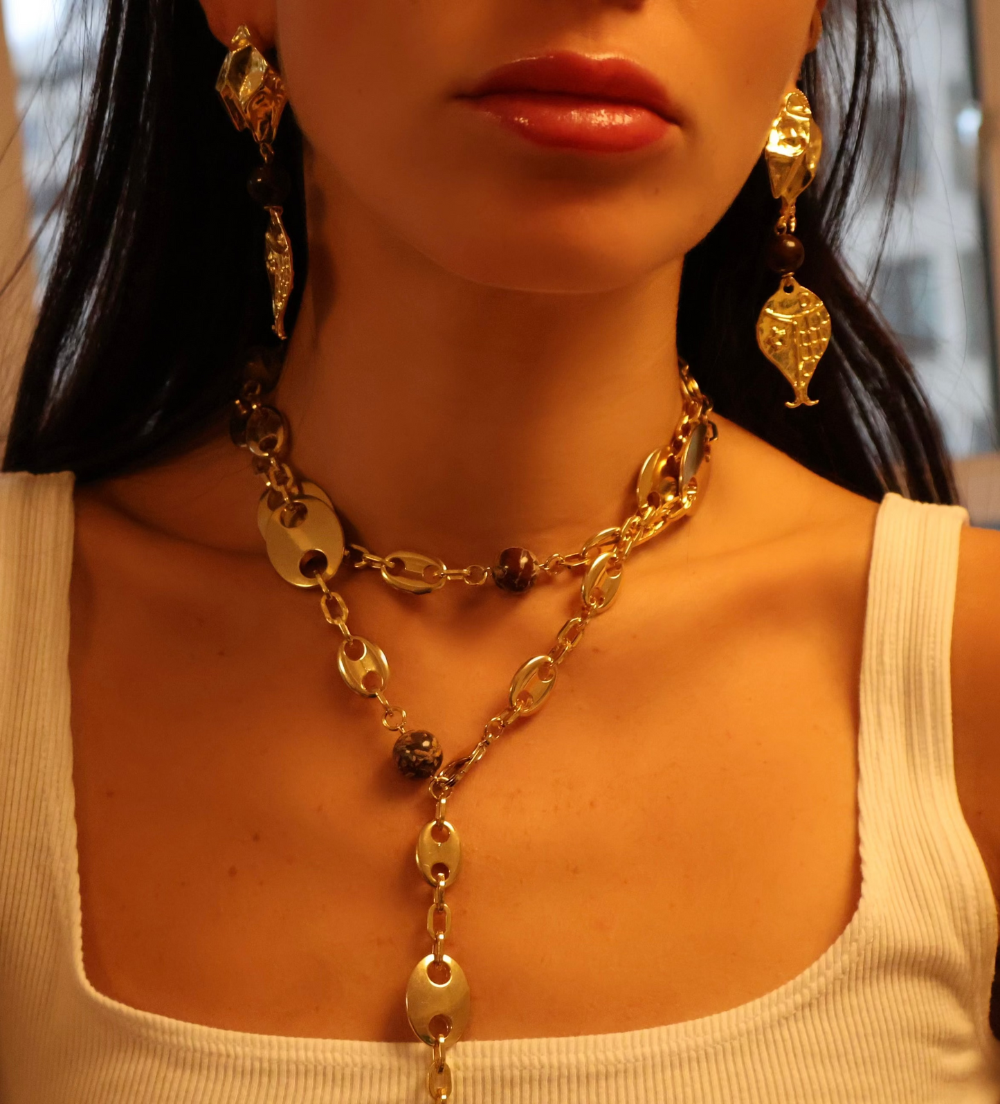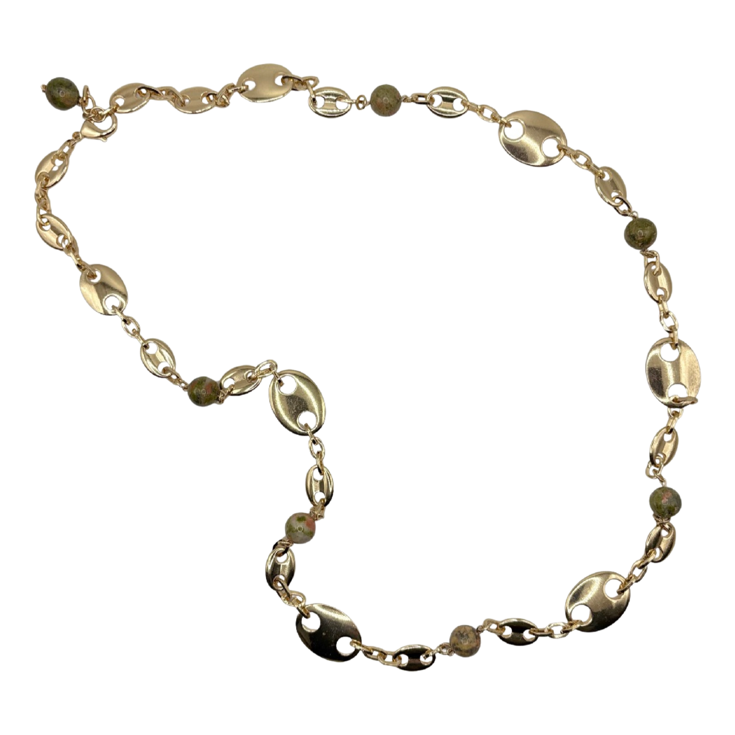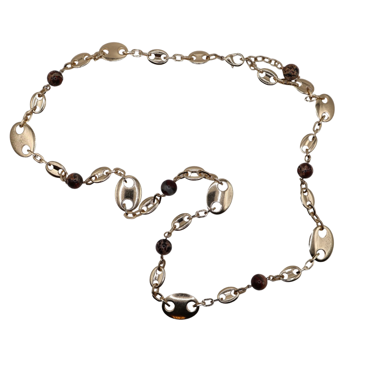 A mariner-link chain accented with natural stone beads spaced throughout the design. Versatile and stylish, it can be worn as a statement necklace or doubled as a chic waist belt.