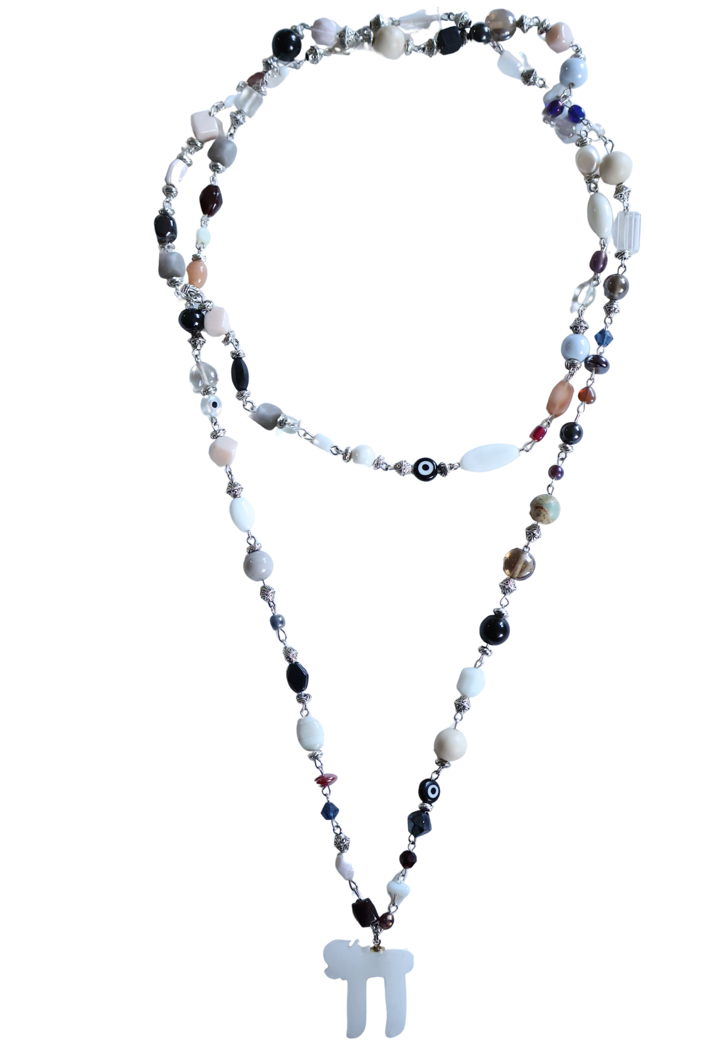 This beautiful long necklace is made with a mix of smooth and shiny beads in soft neutral colors black, white, creams. Each bead is carefully linked together to create a delicate chain that drapes beautifully. Small silver details add just the right touch of sparkle. It’s an easy-to-wear piece that looks great with both casual and dressy outfits.