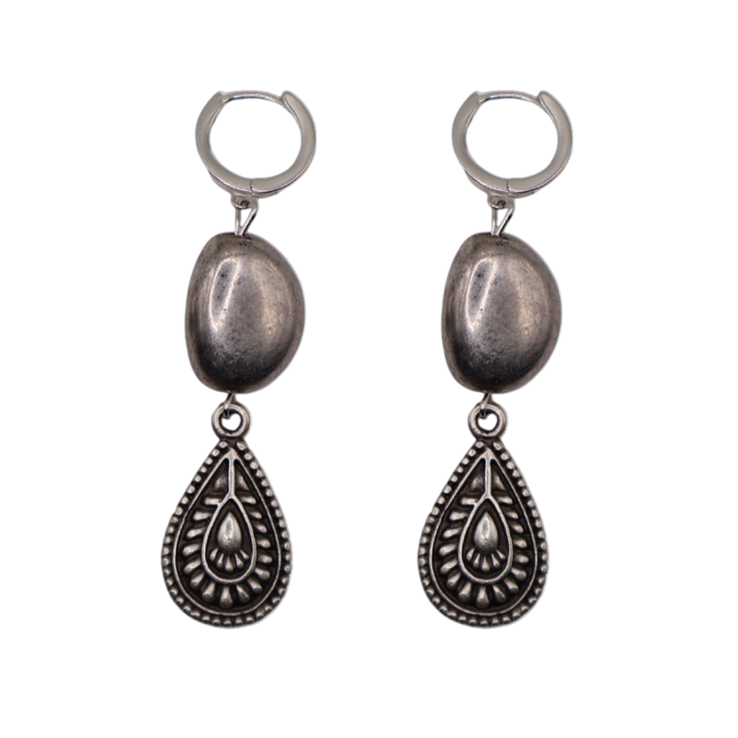 Polished pebble stones paired with engraved paisley drops. Lightweight earrings with subtle movement and vintage-inspired detail