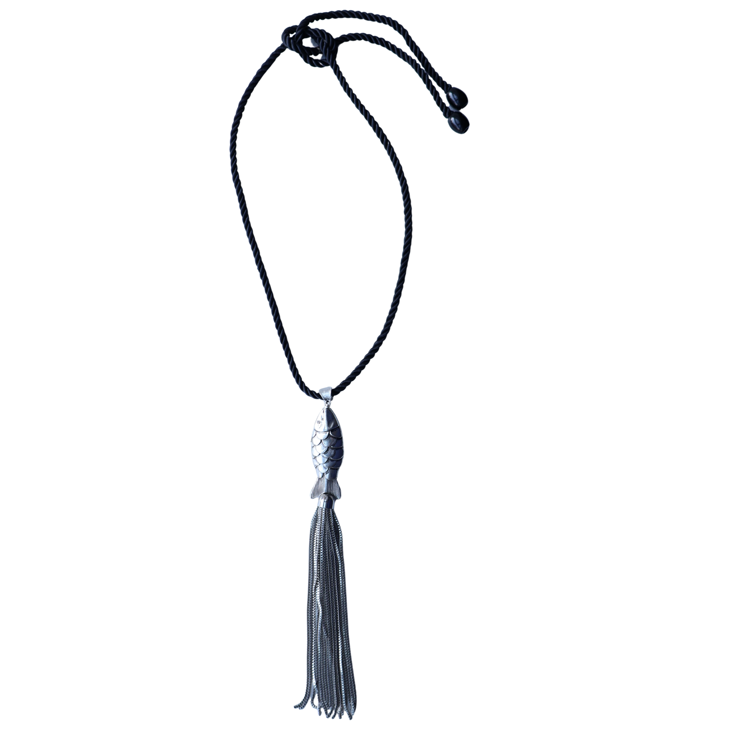 Tie back black Corded string with a Silver Fish Pendant and Silver Tassel. Effortless and Cool