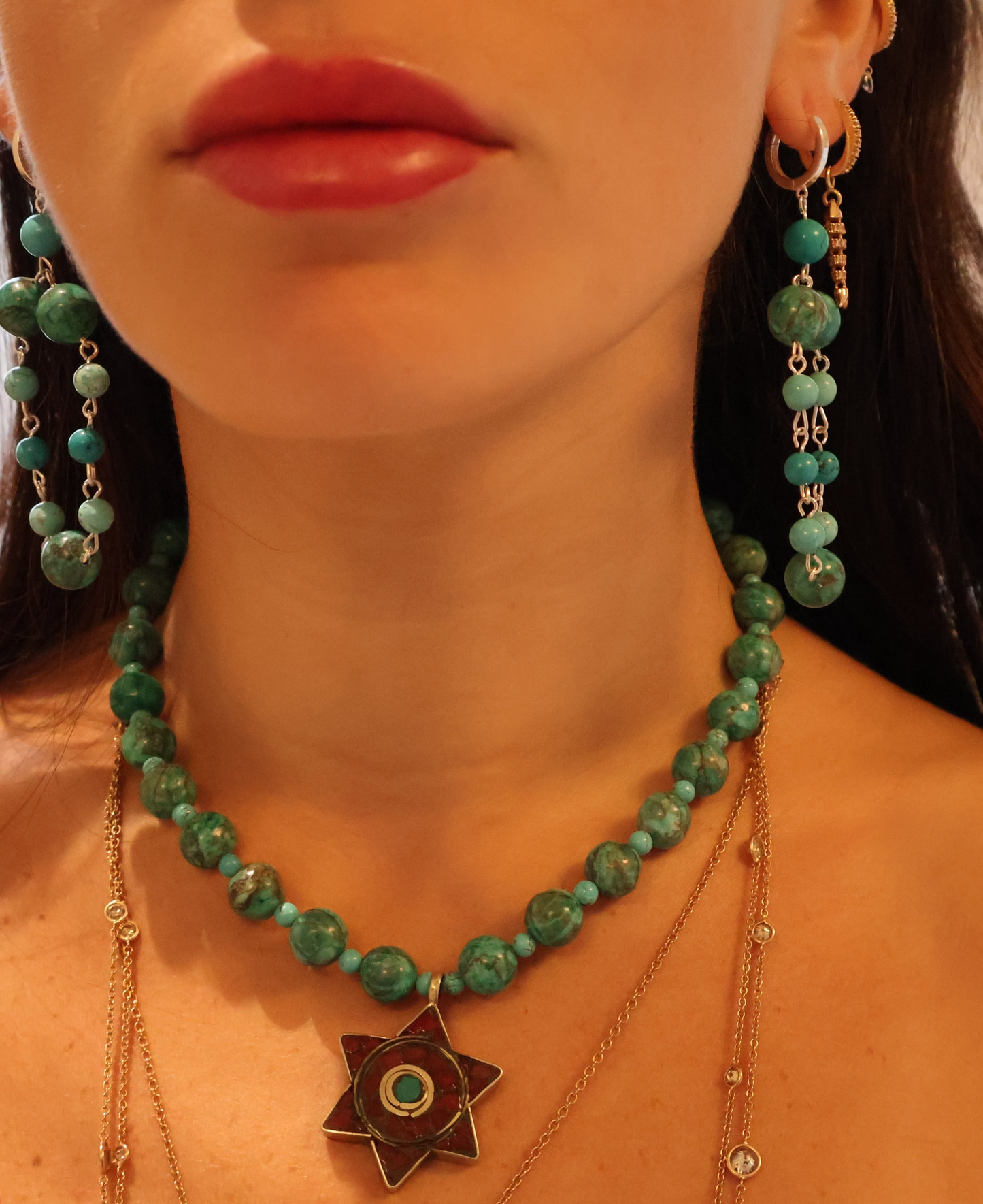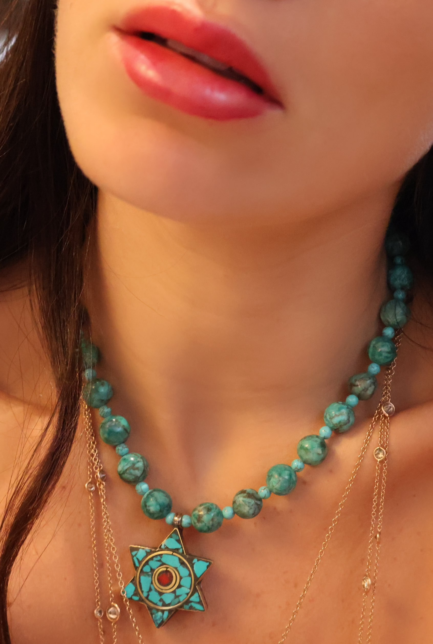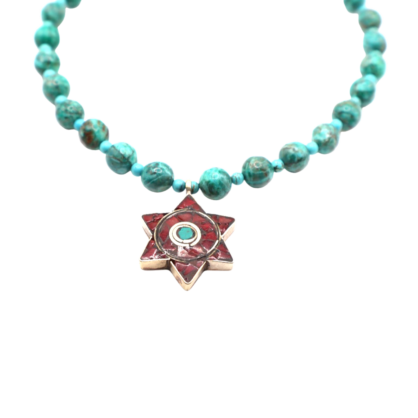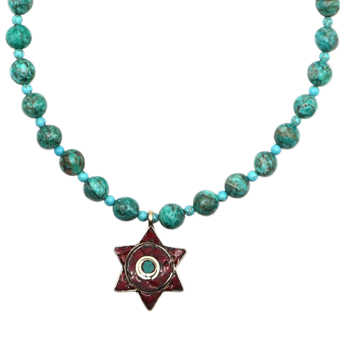 Turquoise-toned stone beads finished with a carved stone star pendant. Bold yet balanced, perfect for everyday layering